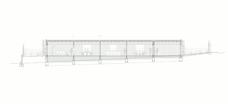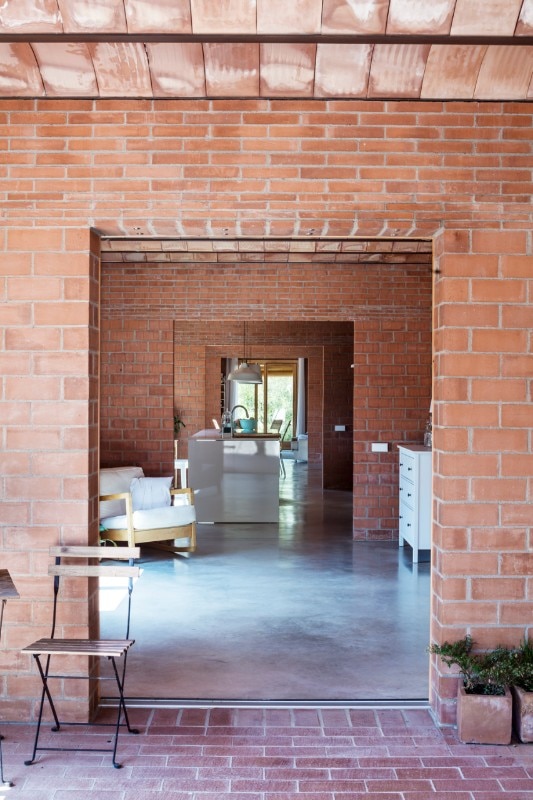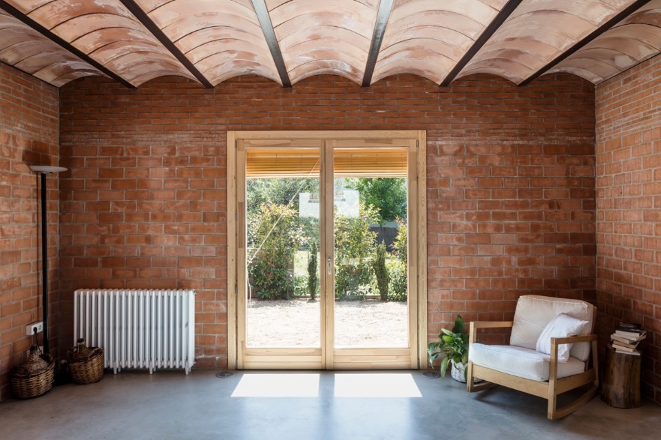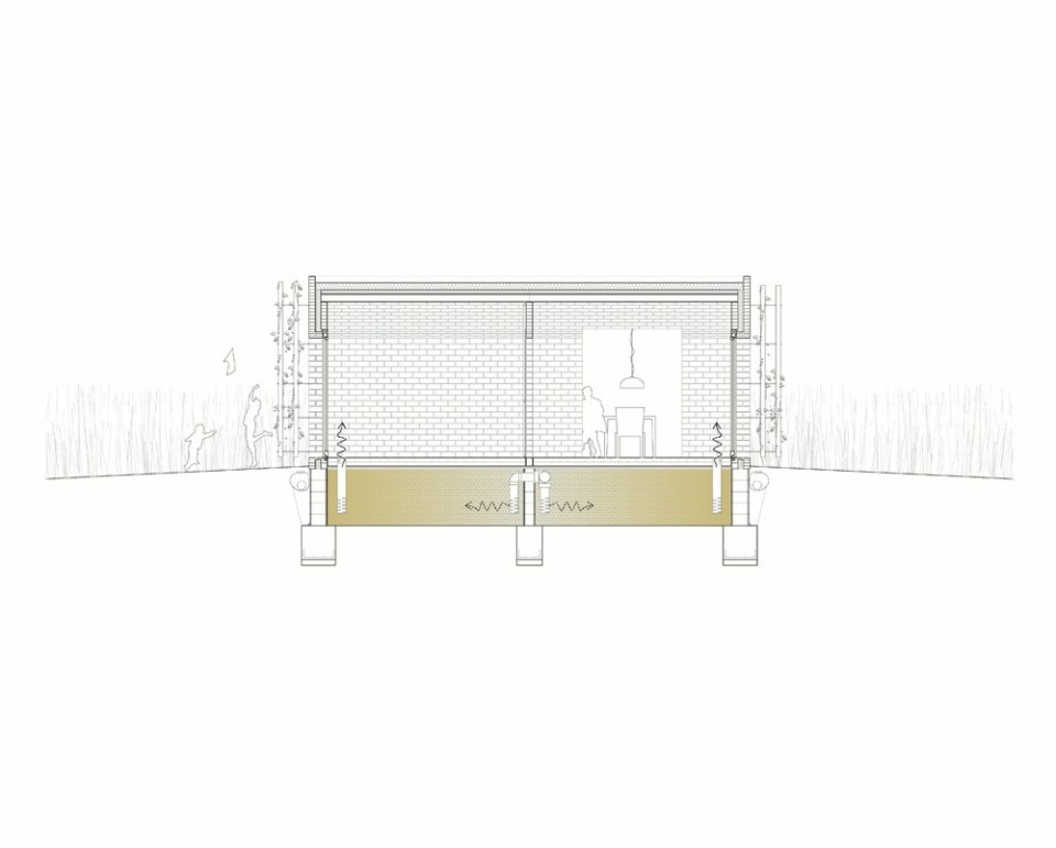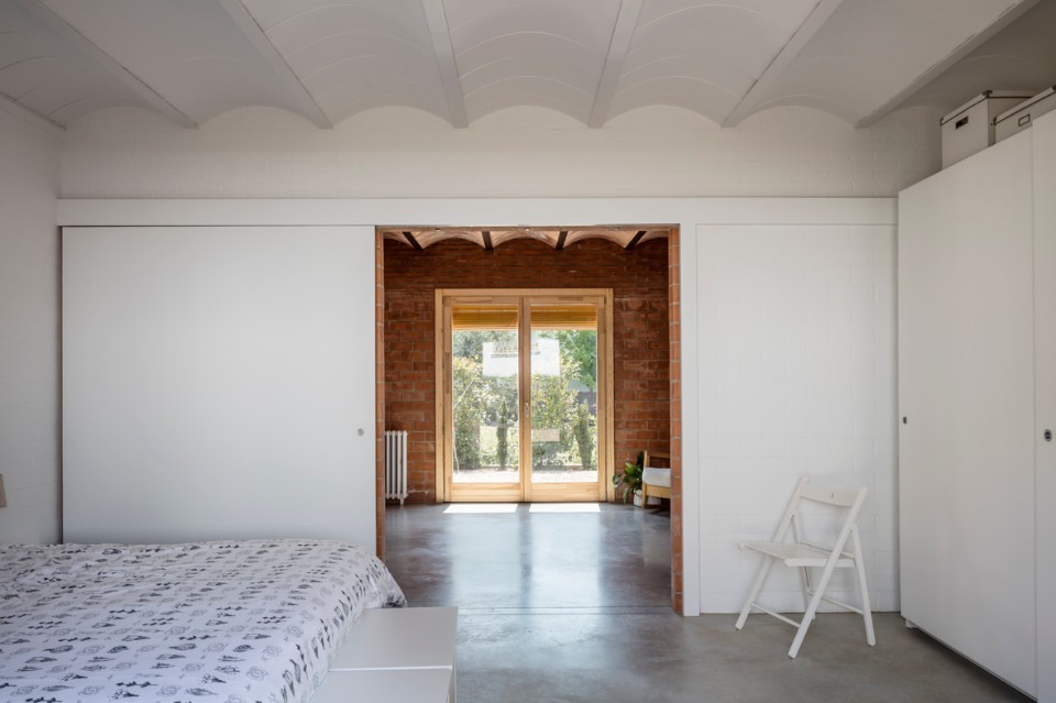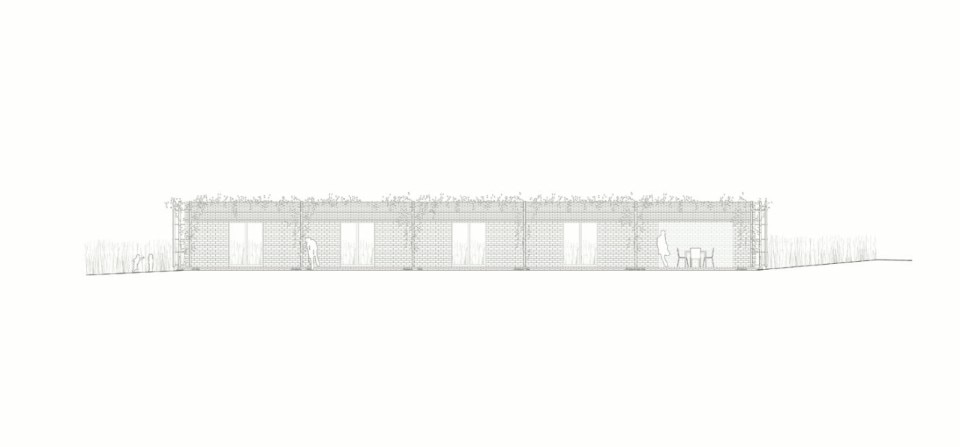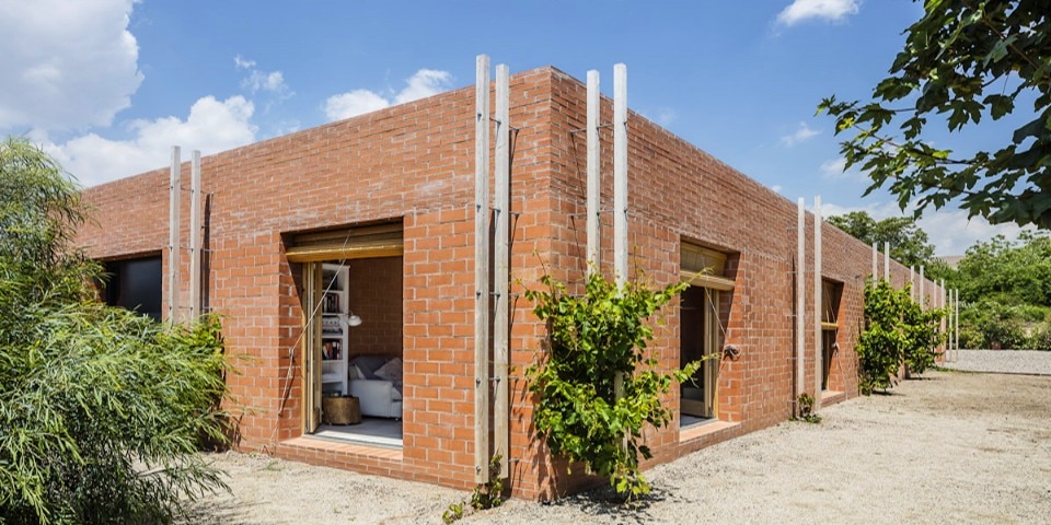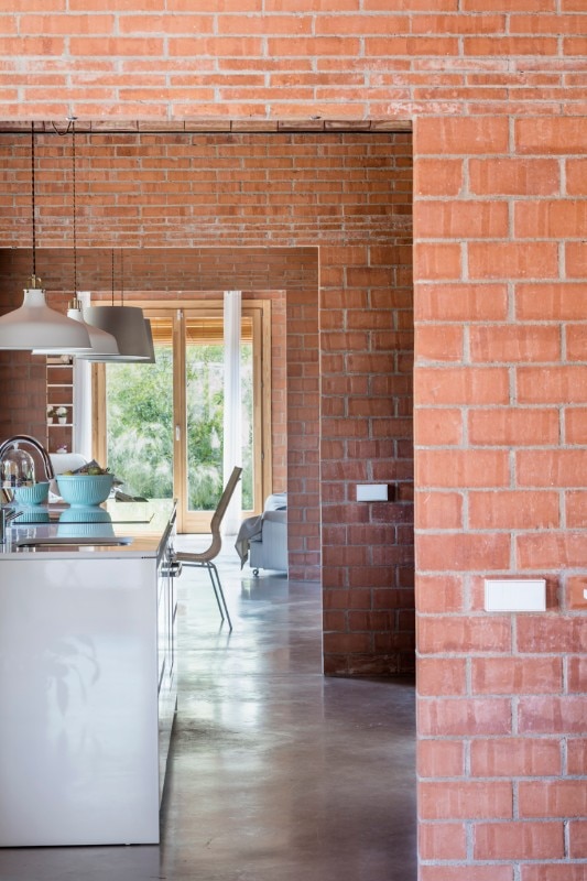 Le funzioni della casa di mattoni sono distribuite in dieci spazi uguali di 3,5x5,12 m. La versatilità degli ambienti di 18 mq e le loro relazioni offrono, sorprendentemente, una grande flessibilità e permettono di immaginare diversi usi nel corso degli anni, con stanze indipendenti o utilizzate come uno spazio unico. L’architettura è minima ed essenziale, evitando gli elementi superflui. La casa è un’infrastruttura in cui gli abitanti possono scegliere il modo migliore di appropriarsene. Per proteggere gli ambienti interni dalla luce solare è stata pensato un sistema di vegetazione che crea un soglia d’ingresso. Il verde riduce l’impatto visivo della costruzione che col tempo si fonderà con il giardino.
