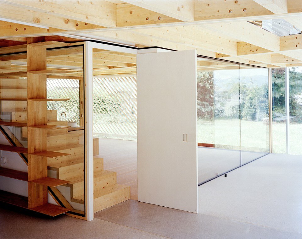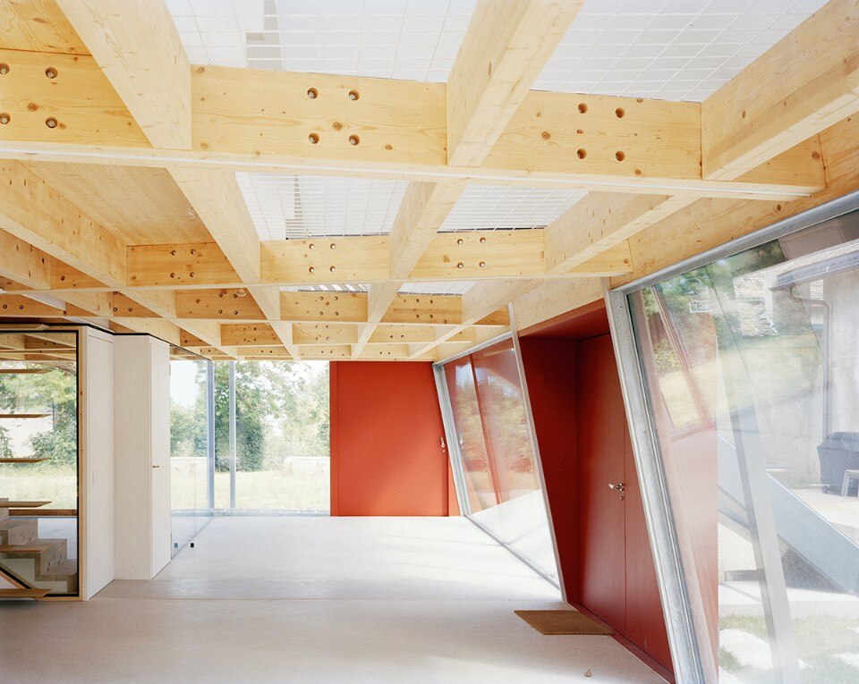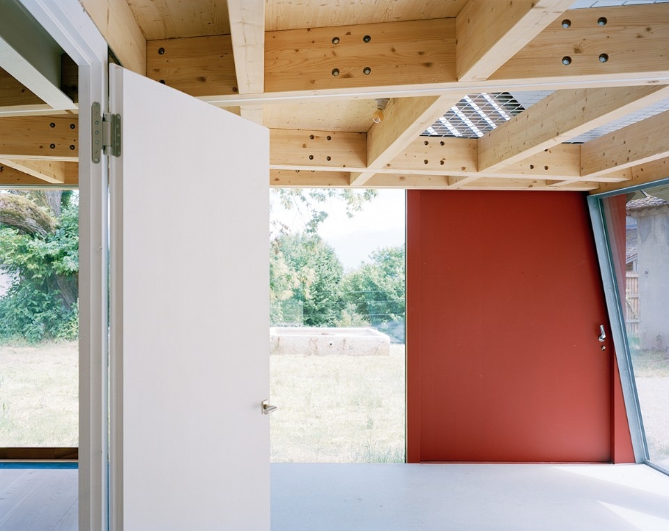 Ognuna delle due case è organizzata attorno a un ambiente ampio e a doppia altezza, uno spazio condiviso per le persone che vivono in entrambe le residenze. Queste sono infatti pensate per essere vissute in modo congiunto. Le due strutture presentano la stessa gamma di materiali base, per accentuare le somiglianze e le differenze genetiche. Del vecchio edificio ristrutturato sono stati mantenuti la struttura di legno, le pareti esterne e le opere di carpenteria. Gli elementi strutturali adesso in mostra raccontano la storia dell’edificio. Le nuove aperture seguono le proporzioni di quelle esistenti, letteralmente disegnate attorno alle facciate.