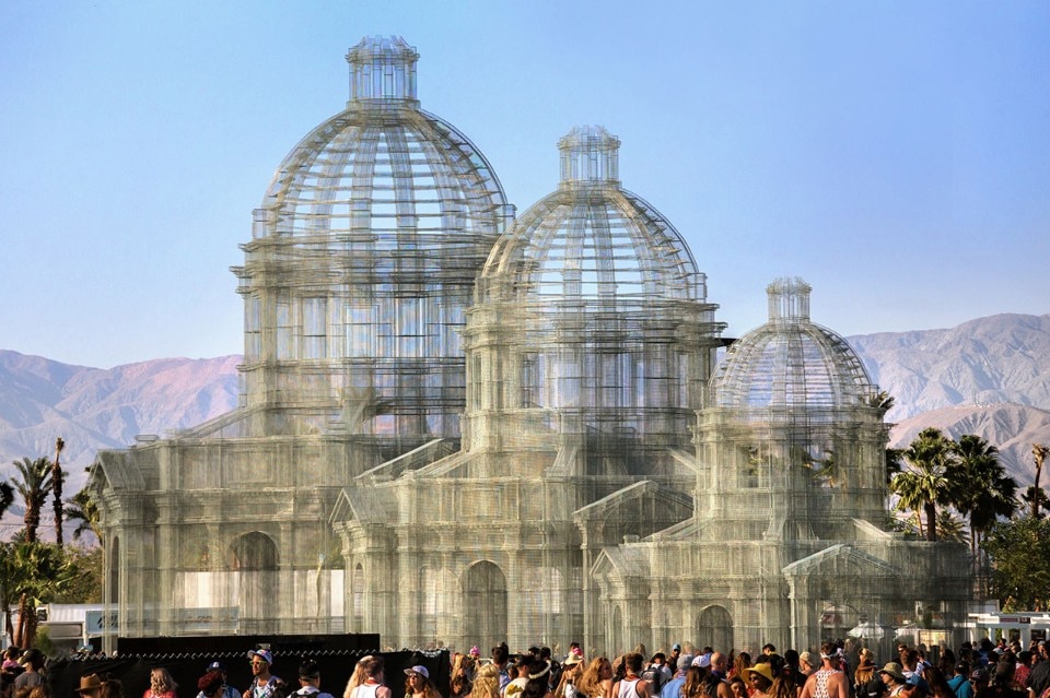 Etherea è l’installazione site-specific ideata per l’edizione in corso del festival californiano, uno degli eventi musicali più importanti e attesi al mondo. L’opera, la più grande realizzata finora dall’artista, è anche la maggiore del festival californiano, che dal 2009 commissiona ad artisti internazionali sculture monumentali all’interno del suo vasto recinto. Una realtà unica delle arti visive contemporanee, sempre più cruciale anche all’interno della sperimentazione architettonica, che quest’anno ha convocato, assieme all’autore dell’intervento della basilica di Siponto, artisti del calibro di Newsubstance, Simon Vega, R & R Studios, Randy Polumbo, Adam Ferriss, Katie Stout. Etherea, rappresenta il culmine della ricerca di Tresoldi in ambito musicale, dopo i festival Life Is Beautiful, Roskilde, The Secret Garden Party, Eaux Claires e DERIVE.
