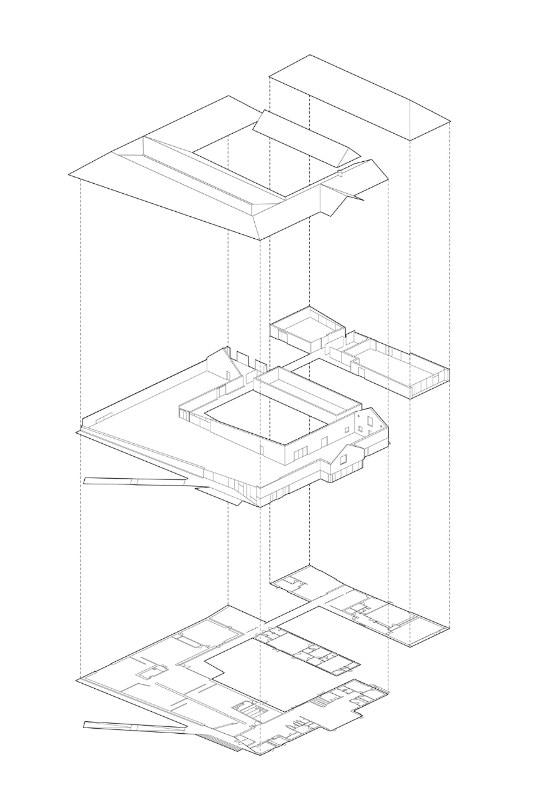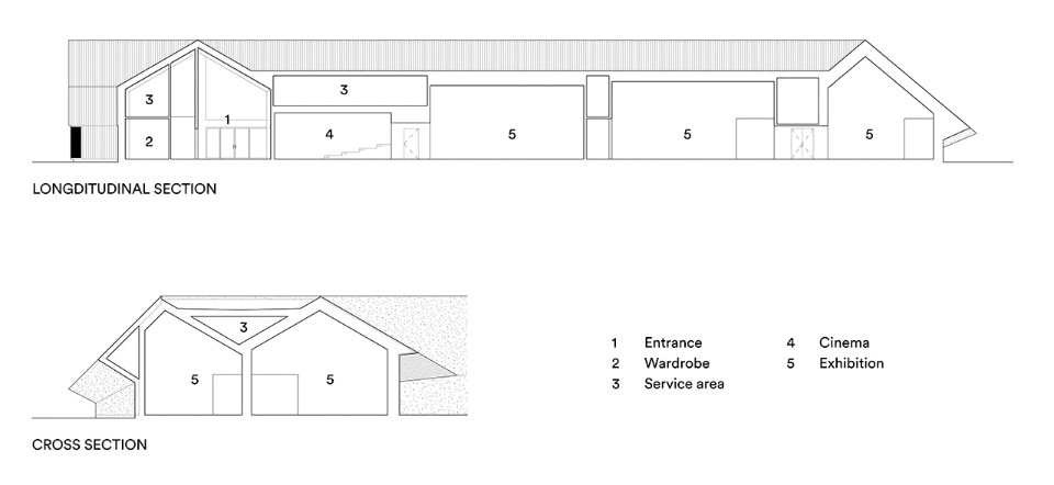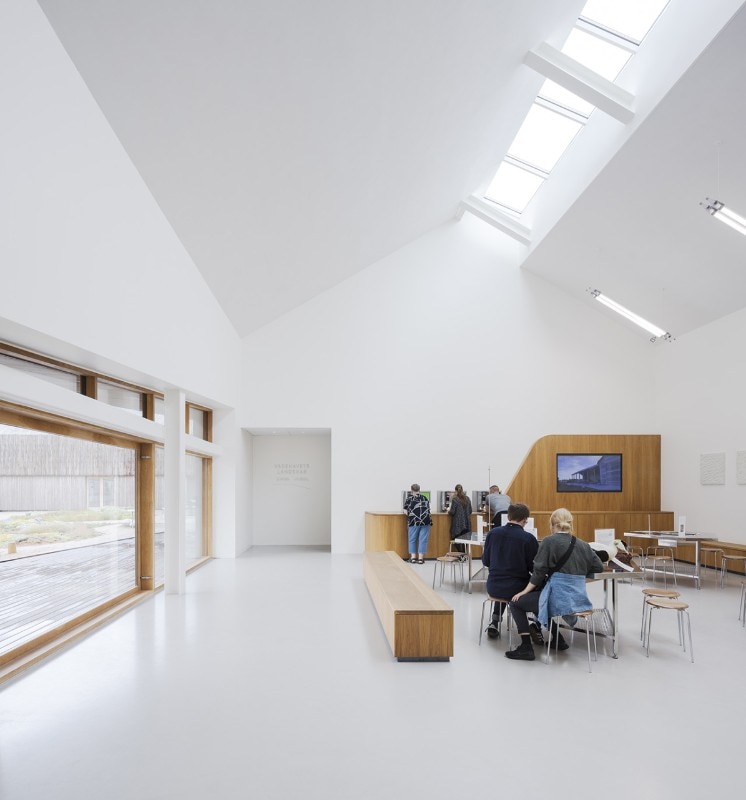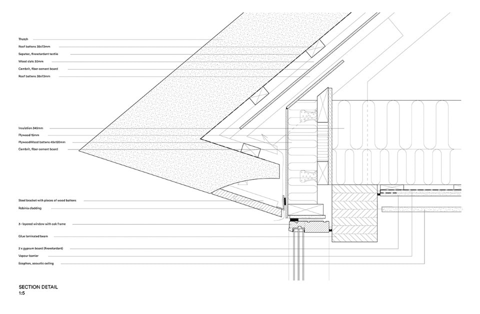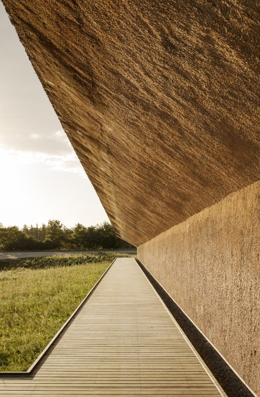 Il progetto si relaziona alla tradizione locale di tetti e facciate rivestiti di canne d’acqua, una tecnica apparsa in epoca vichinga. L’intervento integra parzialmente l’edificio esistente, tipologicamente inquadrato come fattoria a quattro ali. La paglia per i 2.600 mq di superficie realizzati con questa tecnica sono state raccolte localmente e una forte enfasi è stata posta sul tema delle misure antincendio, progettate in collaborazione con esperti sia della Danimarca che dell’Olanda. In contrasto con l’edificio esistente, Dorte Mandrup nasconde il telaio in acciaio nella costruzione mentre la tecnica di costruzione è stata mantenuta per l’estensione. Le facciate, le cui aperture sono state ampliate e adattate, sono costituite da partizioni prefabbricate di legno con proprietà isolanti. 3.200 metri di doghe in legno di robinia sono state utilizzate come rivestimento e installate a distanza dalle pareti esistenti. Questo legno richiede poca manutenzione e con il passare del tempo si prevede che otterrà una patina grigio argento. Mentre il legno di quercia trattato ad olio è stato utilizzato per incorniciare le pareti divisorie in vetro, marciapiedi e terrazze sono stati pavimentati con pino Thermowood.