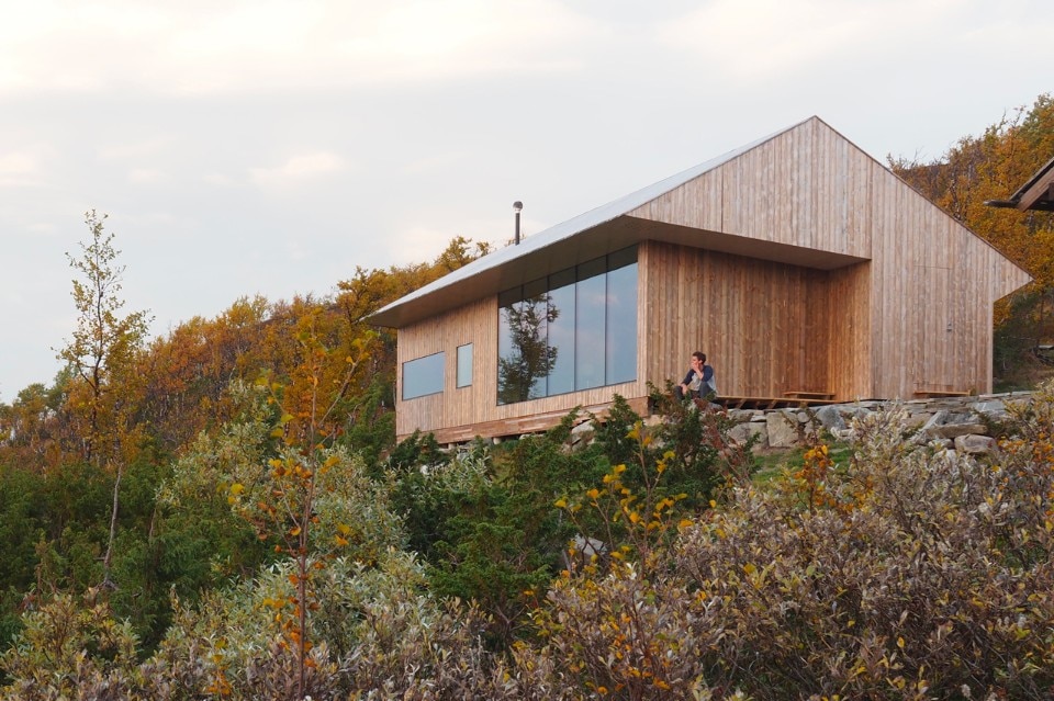 Progettato dall’architetto norvegese Jon Danielsen Aarhus, il bungalow è rivestito di legno di pino, sia internamente sia esternamente. Le finestre guardano le montagne, un lago e un ghiacciaio, tutti nello stesso panorama. Con questa visione in mente, il progetto della stanza principale doveva integrare il paesaggio all’interno della capanna di legno. Tutta la facciata rivolta a ovest è quindi completamente vetrata. Il soffitto è inoltre leggermente inclinato in modo da proiettare ancor di più la stanza verso l’esterno. Insieme, soffitto e vetrata reinterpretano il gapahuk, una tradizionale tipologia di capanna norvegese usata per le escursioni in montagna.