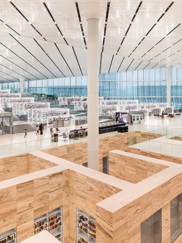 Un nuovo polo culturale multilivello: dedica molti spazi alla divulgazione e alla fruizione pubblica dei suoi spazi, ma rivolge altrettanta attenzione ai volumi specialistici (conserva oltre 4 mila manoscritti, una antica mappa Tolemaica del 1478 intitolata “Sexta Asiae Tabula”, documenti antichi del VII secolo a.C. ). Si trova nel cuore della cittadella universitaria, che ospita ogni anno 10 mila studenti. I libri 800 mila - sono tutti in esposizione e costituiscono parte del paesaggio interno, che ha la caratteristica, rispetto alle consuete biblioteche, di lasciare molto spazio a ciascun fruitore. Non si ha alcuna percezione claustrofobica attraverso i sensi, né di eccessivo silenzio, anzi: l’idea è che la cultura possa divulgarsi principalmente attraverso l’apertura dello spazio e tra la gente - la hall principale è quasi un unico spazio, diviso dalle pareti dei libri su più livelli. Non c’è alcuna separazione tra libri e persone. Idealmente la cultura si propaga come l’aria: coinvolge quanta più gente possibile nello spazio che la contiene. E infatti la biblioteca ricorda molto un centro culturale e di intrattenimento (tipo il Centre Pompidou), poiché organizza molte attività: laboratori per bambini, stampanti 3d per i prototipi, spettacoli di teatro all’interno di un piccolo auditorium dedicato agli eventi speciali nella hall principale che si separa attraverso una tenda che si può rimuovere. “Il ruolo delle biblioteche nell’incontro pubblico è più significativo che mai”, commenta Ellen van Loon, partner del progetto. Gli scaffali dei libri fanno parte dell’edificio in termini di materialità: sono prodotte con o stesso marmo dei pavimenti. La collezione dei libri antichi è posizionata al centro della biblioteca in uno spazio sotterraneo di 6 metri, rivestito di travertino beige, “sotterraneo come un sito archeologico”, continua Ellen van Loon.