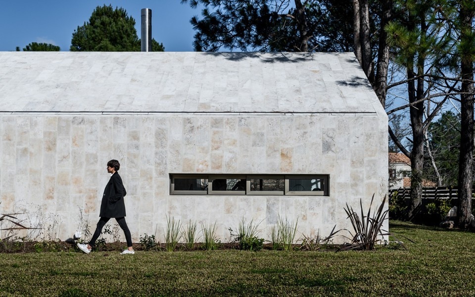 Questa archetipica casa a capanna è stata rivestita in modo contemporaneo con una pelle di travertino e una serie di finestre che si affacciano su un bellissimo parco vicino a Buenos Aires, Argentina.