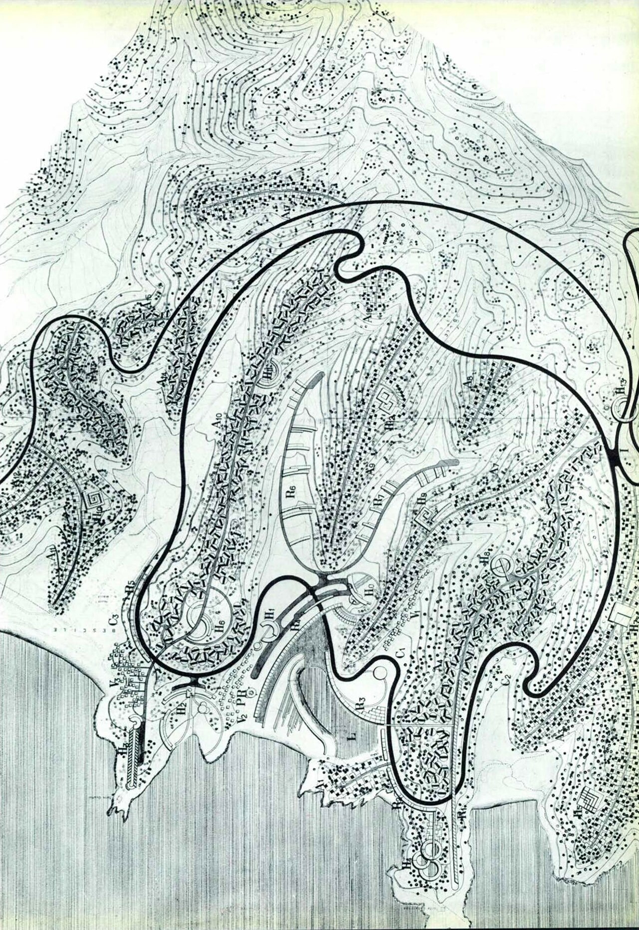 Ed è certamente grandioso il disegno di questo territorio delle vacanze, che D’Olivo articola in strettissima relazione con la geografia di crinali e valli, promontori e baie di Manacore. Un unico tracciato anulare connette gli accessi ai diversi nuclei dell’insediamento: il centro civico, a monte, alla confluenza con la statale costiera; il centro turistico, nei pressi della spiaggia; le case, tutte panoramiche, sulle vette e gli edifici collettivi negli avvallamenti.