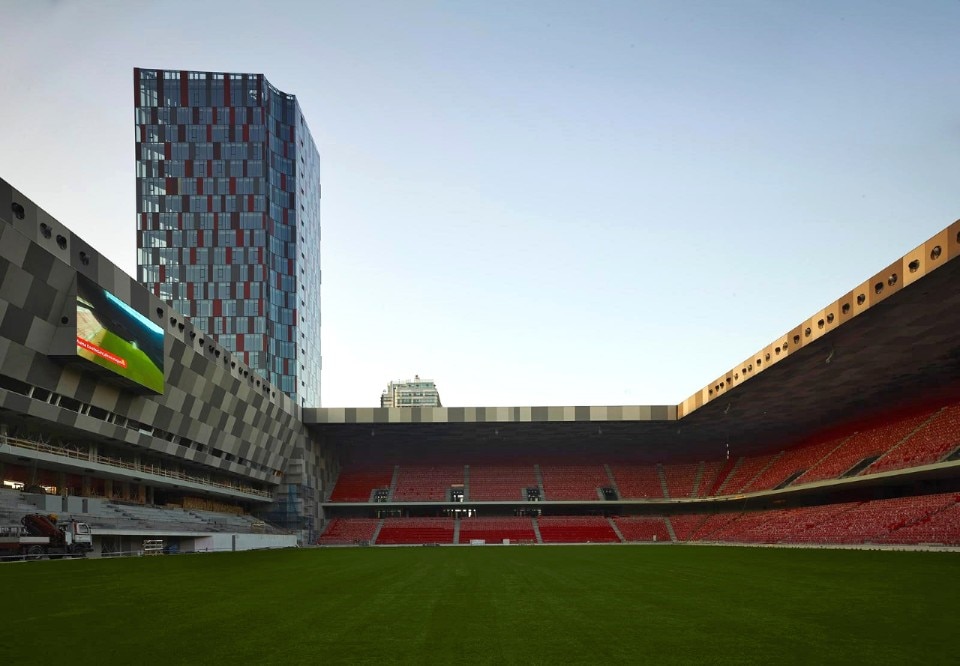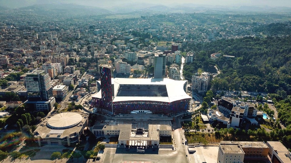 Del Qemal Stafa Stadium di Tirana resta oggi l'ingresso monumentale sul lato di Piazza Italia, affacciato sulla struttura porticata di Bosio che lo separa da piazza Madre Teresa. “Per recuperarlo, abbiamo costruito un ponte lungo 50 metri che sostiene la struttura”, spiega Marco Casamonti di Archea Associati, lo studio — fiorentino, come Bosio — che ha progettato il nuovo Air Albania Stadium, durante la conferenza stampa all’Hotel Plaza di Tirana in cui racconta il progetto a una delegazione italiana a poche ore dall’inaugurazione. Non una semplice arena, ma un edificio pubblico contemporaneo, con negozi e un porticato, e una torre che diventerà un hotel nel 2020. Uno stadio da 22mila posti all'inglese, costruito per la Federazione calcistica dell’Albania — le squadre di Tirana giocano in una struttura da 5000 posti fuori dal centro — con gli spettatori vicinissimi al campo da gioco e una struttura che si ispira all'anfiteatro; gli spalti sono concentrati su tre lati, le due curve e una tribuna centrale. All’interno il colore predominante è il rosso della bandiera albanese e dello sponsor. Una cornice dove si alternano quadroni grigi corre sopra gli spalti e lo stesso motivo si ripete anche l'interno della copertura.