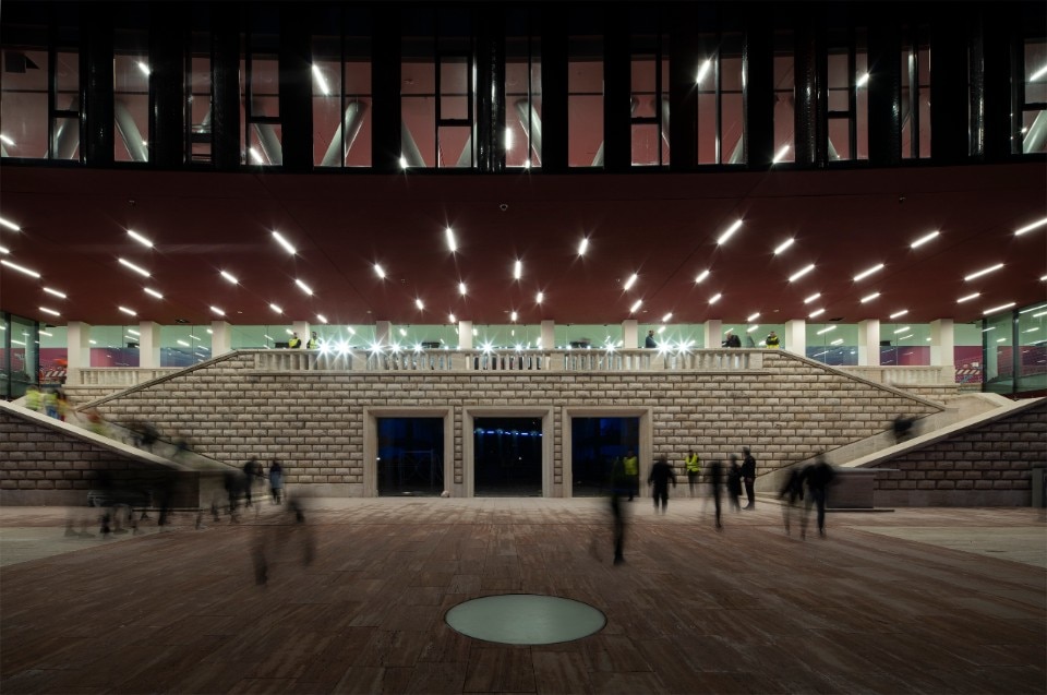All'esterno 30mila metri quadri di facciate rivestite in vetro conferiscono all'Arena Kombatere l'aspetto di un edificio urbano, niente a che vedere con la semplice struttura che l’ha preceduta. Sono state ricavate due piazze laddove prima c'erano le curve della pista di atletica. Un “red carpet”, come lo definisce Casamonti, di travertino rosso persiano, corre davanti all'ingresso monumentale di Bosio, ricostruito e integrato nella nuova struttura come simbolo di continuità e omaggio al passato: “La vecchia facciata è stata smontata, i pezzi numerati e lavati, poi rimontata”, spiega l'architetto fondatore di Archea. “Con questo stadio, gli albanesi hanno scoperto cosa sia un'opera di restauro”. Qui di monumenti antichi ce n'è ben pochi. In compenso, c'è una certa maestria nel trattamento dei metalli: tutte le lavorazioni delle 6500 tonnellate di acciaio utilizzate per costruire lo stadio sono state fatte in Albania, tranne alcune particolarissime realizzate con tecniche laser 3D. Soprattutto, sottolinea sempre Casamonti, c'è un grande desiderio di arte e architettura. Qualcosa che in Italia, dove abbiamo tanto e forse troppo, ci siamo persi. “E tutto qui avviene in maniera più veloce”. Anche costruire uno stadio il cui costo in Italia si aggirerebbe intorno agli 80 milioni di euro. I lavori sono durati tre anni e hanno coinvolto circa 6000 persone. 3 gli incidenti, di cui uno mortale: un operaio per controllare che nessuno si facesse del male durante una operazione, si era tolto le sicurezze ed è caduto, racconta l’architetto.