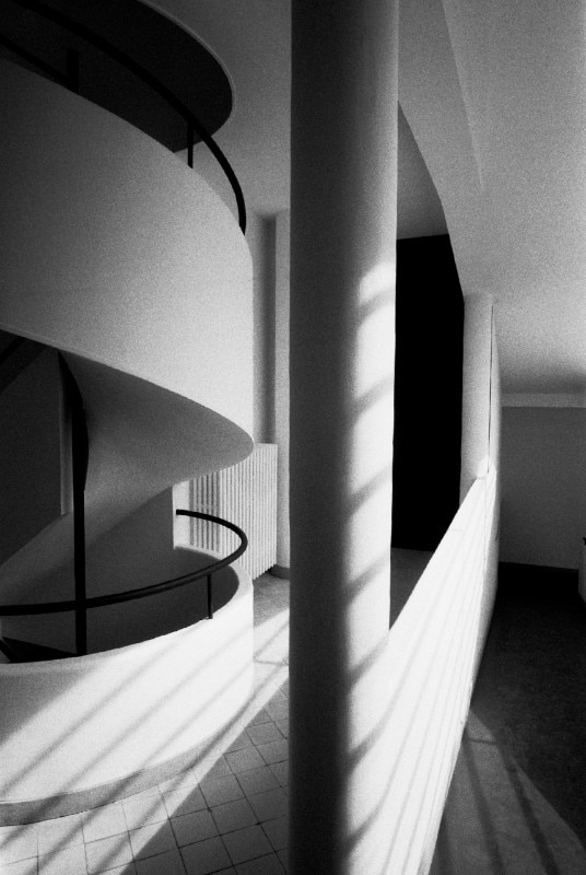 A differenza di Villa Savoye, che è raggiungibile in macchina, la Casa per lo Studio dell’Acqua si trovava su un pendio troppo ripido e bisognava arrivarci tramite una scalinata detta “la Scala di Giacobbe”. “Alla mia età”, mi aveva spiegato Hannah Kallenbach, “tutte quelle scale ti rovinano la vita. Io avrei fatto installare una funicolare elettrica”. In cima trovai un giardino in sfacelo e un laghetto per i pesci interrato. La mia prima impressione della casa in sé, vista dal vero, fu che era molto più piccola di quanto sembrasse in foto. L’intonaco esterno era scadente e corroso, solcato di crepe. Mi aggirai in cerca dell’ingresso, e alla fine lo trovai sul retro. Dovetti farmi largo attraverso lo strato di edera troppo cresciuta che ricopriva la porta, come per tenere lontani gli ospiti indesiderati. L’atrio era fiancheggiato da una rampa e una scala a chiocciola, mentre proprio davanti a me un corridoio superava un piccolo lavabo e terminava con una porta leggermente decentrata. Ipotizzando un’organizzazione orizzontale mi avviai lungo il corridoio e arrivai alla porta, che si apriva su quella che pareva una lavanderia in disuso. Poi tornai sui miei passi e salii la rampa che portava al primo piano. Le pareti bianche che la costeggiavano erano sgretolate e macchiate, ma decorate da chiazze di luci e ombre proiettate dalle striature delle finestre di vetro rinforzato e dalle linee verticali dei tubi del riscaldamento in alto. Un lungo corridoio azzurro si dipartiva dal pianerottolo del primo piano verso le camere da letto, la cucina e la zona giorno.