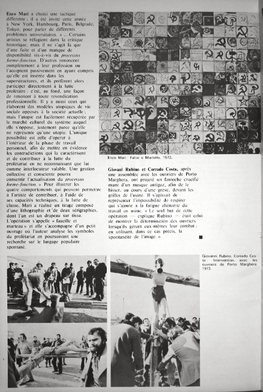 Questo fatto lasciò qualche dissapore tra noi ma continuai a seguire la sua attività e ho riflettuto sulla sua figura in occasione della mostra che si è inaugurata alla Galleria Milano lo scorso 29 settembre, remake puntuale di quella che si tenne il 9 aprile 1973 intitolata Falce e martello, tre modi in cui un artista può contribuire alla lotta di classe suscitando enorme scalpore. Edizioni O pubblicò un libretto di poche pagine in cui Mari descriveva in quattro punti e 12 lunghe note la sua posizione.