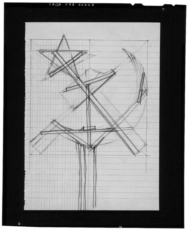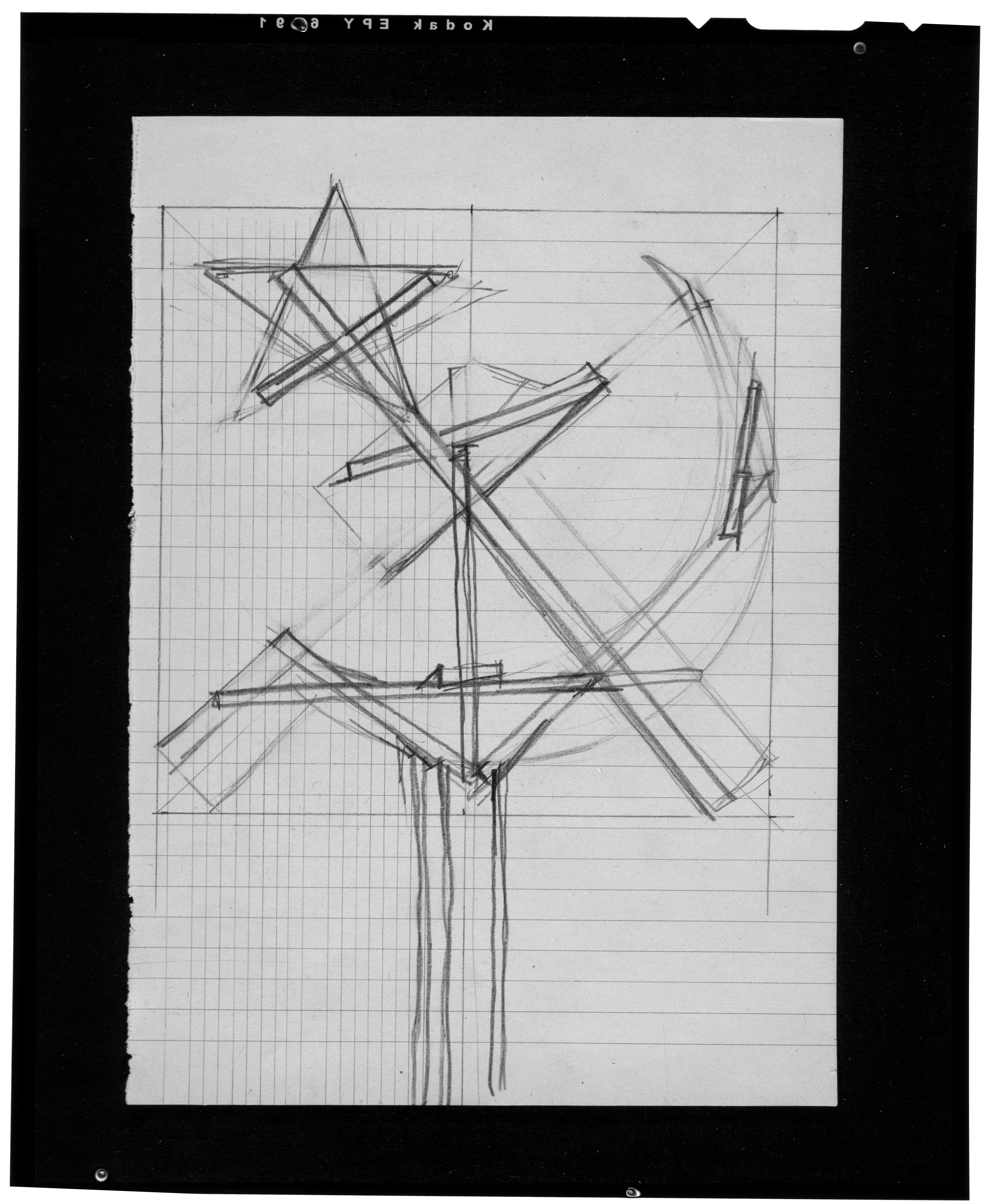 Confrontandone l’immagine con lo schizzo dello studio preparatorio si può riscontrare anche una corrispondenza tra la costruzione grafica della due figure come risulta dagli schemi che ho eseguito. Per cui è ipotizzabile che il valore simbolico della falce e martello che appare come l’elemento di contenuto più rilevante, possa in effetti essere considerato il pretesto cui Mari ha fatto ricorso per applicarsi alla restituzione della struttura formale di quella rappresentazione che gli era risultata di particolare interesse.