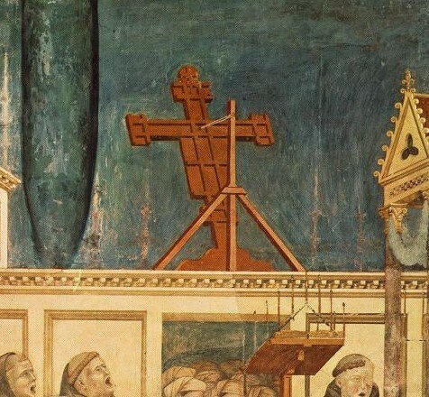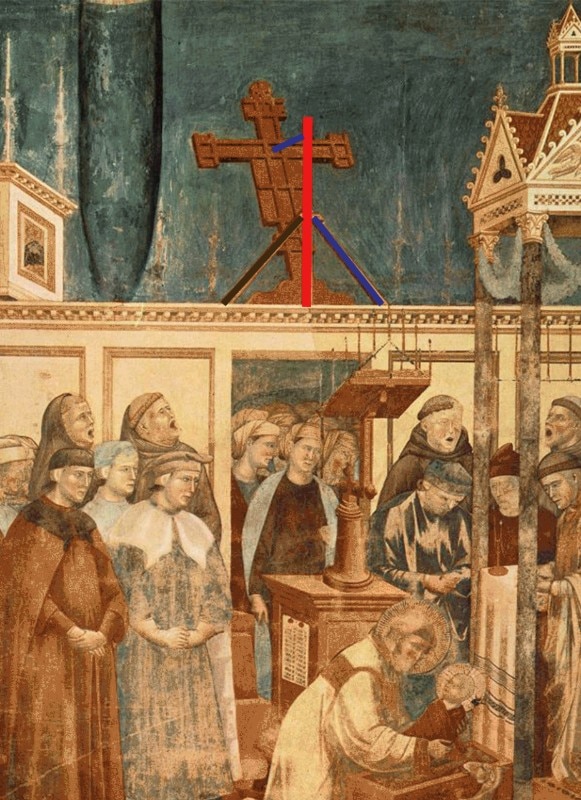È certo che Mari si è ispirato al particolare molto realistico della grande Croce ancorata sulla iconostasi della scena del Presepe di Greccio di Giotto che certamente ammirò ad Assisi in occasione del “modesto Grand Tour estivo” del 1951 che definisce come suo “viaggio d’iniziazione”. Particolare di estremo realismo antiretorico che mostra proprio il retro dipinto di rosso della croce con le sue strutture di irrigidimento, che spicca sullo sfondo scuro dell’interno della Porziuncola.