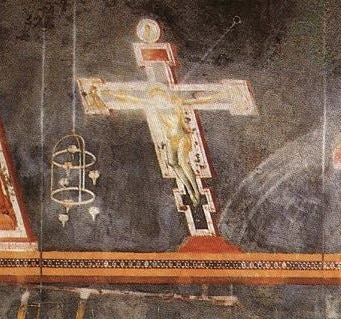 Il dettaglio a cui Mari si è ispirato figura, anche nella scena delle Storie dedicata a Girolamo che esamina le stimmate sul corpo di Francesco che giace morto all’interno della Porziuncola e rivela che quello rappresentato da Giotto è il Crocifisso di Santa Maria degli Angeli, croce sagomata dipinta da Giunta Pisano tra il 1230 e 1240 conservata nell’omonimo museo di Assisi.