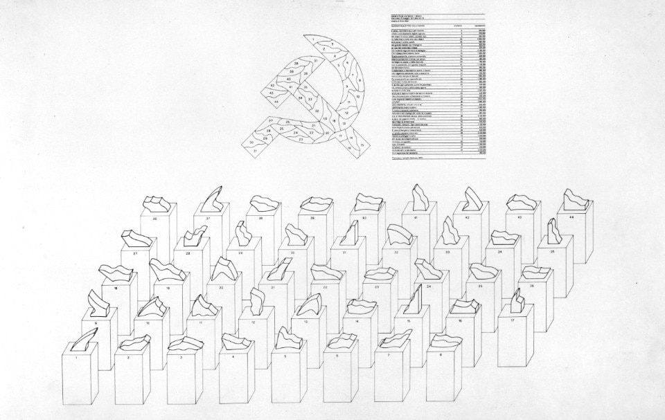L’epilogo di questo lungo processo di reinterpretazione del simbolo della falce e martello è rappresentato dal progetto n. 1220 Quarantaquattro valutazioni del 1976 – poi presentato alla Biennale di Venezia del 1978 - nel quale Mari lo scompone in un puzzle i cui elementi diventano 44 sculture differenti nelle quali la falce e martello non è affatto riconoscibile. Mi sento di affermare che questo progetto rappresenta il modo in cui Mari si è congedato non soltanto dal simbolo ma anche dall’ideologia che rappresentava