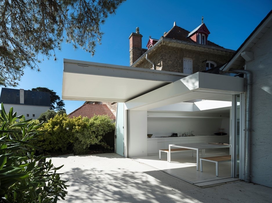 Topless House è una casa per le vacanze sulla costa atlantica, rinnovata da Avignon Architecte collocando un nuovo volume architettonico al posto della vecchia veranda. Il punto forte dell’intervento è un tetto removibile che offre diverse configurazioni spaziali: scorrendo, lascia entrare la luce nella cucina e diventa superficie aggettante verso l’esterno, creando un patio outdoor coperto.