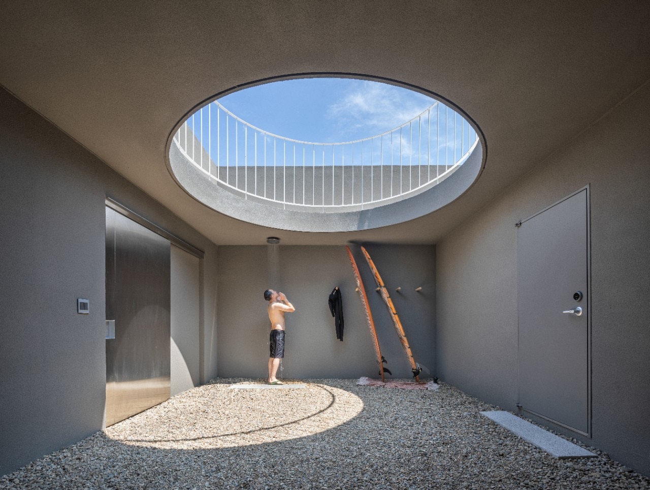 Questa casa a Yangyang è stata pensata per essere funzionale per chi pratica il surf, uno sport molto diffuso in questa località sull’oceano in Corea del Sud. All’ingresso della casa un patio con doccia è illuminato da un grande foro che mette visivamente in comunicazione il piano terra, con i locali di servizio e la zona notte per gli ospiti, e il primo piano. Un’attenzione particolare è data alla composizione materica, che tiene conto della salinità del luogo.