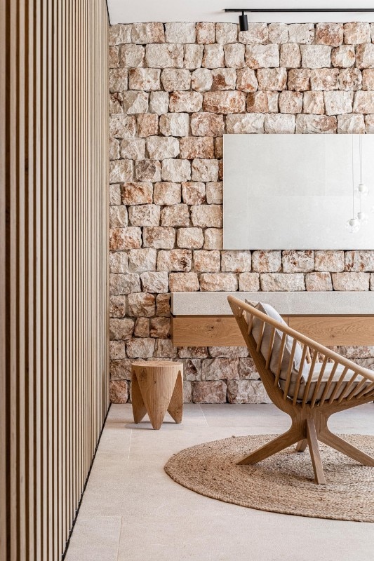 L’utilizzo di una tecnica costruttiva locale, quella della “pedra en sec” – una costruzione in pietra a secco dichiarata patrimonio dell’umanità dall’UNESCO nel 2018 – guida un altro progetto realizzato a Mallorca dallo studio slovacco beef architekti. Il ricorso a mura massicce, utilizzate anche in un’ottica di efficienza energetica, distingue le facciate organizzate su due livelli marcati da un imponente massetto in cemento lasciato a vista. Intervallate da ampie finestre a tutta altezza, le facciate si richiudono attraverso persiane in legno a pacchetto, che trasformano l’edificio in un blocco richiuso su se stesso e proiettando all’interno l’ombra delle proprie lamelle, creando una morbida penombra. Una volta aperte, la casa si trasforma aprendosi all’esterno e alla relazione con la piscina a bordo sfioro antistante, invito all’ozio e alla contemplazione della costa.