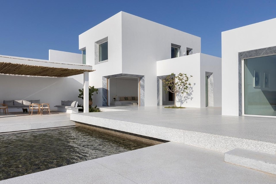Dall’altra parte del Mediterraneo, a Paros, una piscina si ritrova nuovamente al centro dello spazio costruito. Proiettata verso ovest, e più esattamente là dove il sole tramonta in agosto per offrire anche in questo caso un’occasione privilegiata di contemplazione, la villa progettata da Studio Seleirn Architects si sviluppa come una sommatoria eterea di volumi bianchi che, posizionati su lastre in terrazzo sovrapposte, restituiscono la sensazione di levitare sul suolo e sulla superficie d’acqua. Il dialogo tra i materiali è esaltato dal ricorso al marmo Aliveri, che incornicia le finestre donando una nota di ricercatezza alla pulizia dei volumi.
