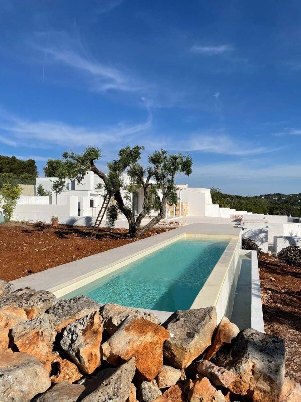 In Puglia, non lontano da Ostuni, l’architetto Massimo Brambilla ristruttura una casa anni ’70, a sua volta esito dell’ampliamento di un piccolo trullo e costruita attraverso la sovrapposizione di blocchi adiacenti. Le stratificazioni degli interventi susseguitisi non sono stati rimossi, come testimonia il profilo irregolare delle finestre, mantenuto al suo stato originale. L’uso del bianco, un codice abbondantemente sperimentato dall’architettura locale, contribuisce ad uniformare gli spazi: all’esterno, l’uniformità della calce fa da legante tra i diversi volumi, mentre all’interno fa da trait d’union con la pietra leccese ed il cemento anche predisponendosi alla distribuzione di numerosi arredi in muratura, semplici volumi bianchi utilizzati tra la zona giorno.