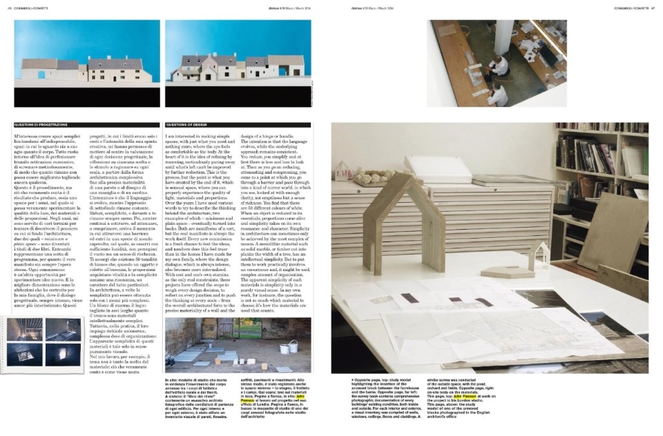 E prima di lasciarci, Pawson stravolge ancora una volta la trama della nostra conversazione e, oseremmo dire, la storia del minimalismo, con una notizia molto legata a Domus: "Quando lavoravo con mio padre a Newcastle, c’era una scuola d’arte, dove andava Brian Ferry andava e insegnava Richard Hamilton- era il 1968 o il ‘69: avevano la prima copia di Domus che io abbia mai visto, ed è stato molto eccitante perché conteneva molte cose che non avevo mai visto – venivo da un contesto isolato – e il lavoro di Kuramata l’ho visto per la prima volta su Domus. Avevo circa 18 anni. Poi nel 1974 sono andato a trovarlo”.