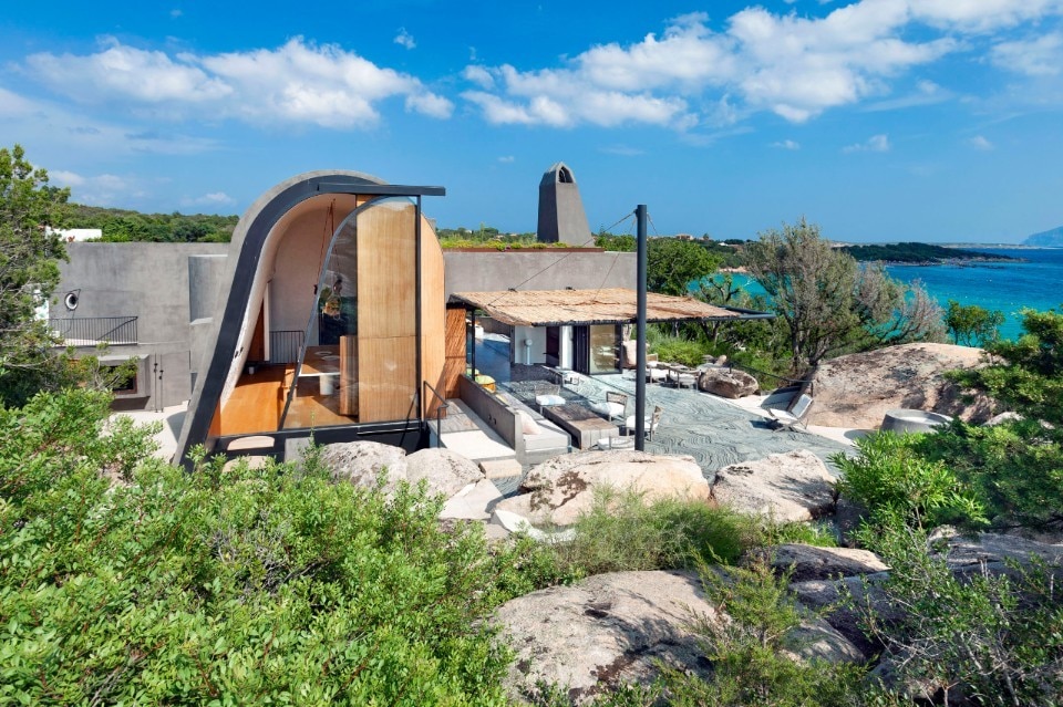 La casa che domina dall'alto l'insenatura di Cala di Volpe nasce dalla roccia e si avviluppa attorno a questa, come se avesse fatto da sempre parte del paesaggio collinare del Pevero. Forme morbide e sinuose interamente rivestite in monoliti di granito conferiscono un carattere quasi primordiale all’abitazione. La villa è attualmente in vendita, per chi volesse perdersi confortevolmente nella macchia mediterranea (potendoselo permettere).