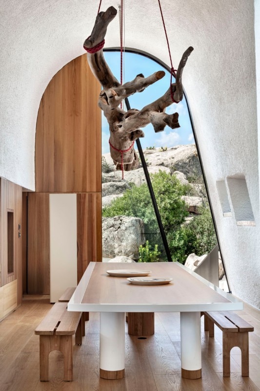 Un percorso abitativo che attraversa una sequenza di spazi complessi, in un contrasto dinamico di volumi rigorosi e forme morbide e irregolari, patii, cunicoli, tetti verdi, e in una celebrazione appassionata dell’avvolgente natura sarda. Cuore pulsante dell’abitazione è il patio centrale ombreggiato, un salotto en plain air che fa da perno ai generosi spazi connotati da un lusso dichiarato ma elegante. Le finiture in legno e ceramica dai toni delicati dialogano con i rivestimenti in pietra serena e gli intonaci grigi, secondo una palette cromatica che fa proprie le tinte ruvide e calde del paesaggio.