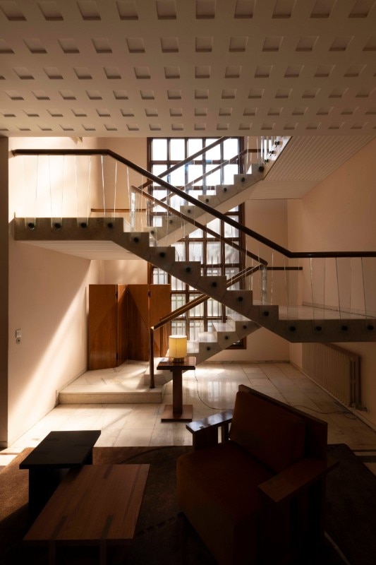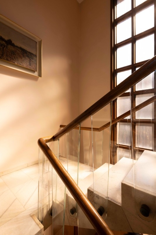 Appena dentro il volume chiuso, una scala in marmo rosa di Candoglia (lo stesso del Duomo di Milano) accoglie gli ospiti in un ambiente luminoso e aereo, facendosi manifesto dei percorsi da intraprendere alla scoperta dell’architettura.