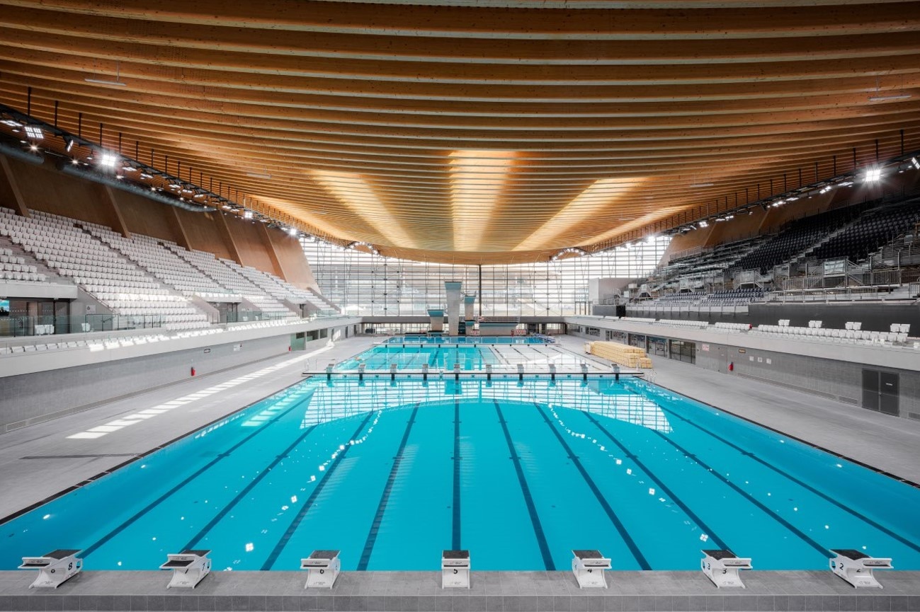 Unico impianto sportivo costruito appositamente per le Olimpiadi 2024, il sito progettato da Atelier 2/3/4 con Venhoeven CS è interamente realizzato con materiali organici a partire dalla copertura ondulata delle piscine, interamente costruita in legno. Dotato di 5.000 mq di pannelli fotovoltaici installati sul tetto, il centro è uno dei più grandi parchi solari urbani di Francia, in grado di assicurare l’autosufficienza energetica della struttura. Il sito è connesso al vicino Stade de France attraverso una passerella pedonale sull’autostrada A1.