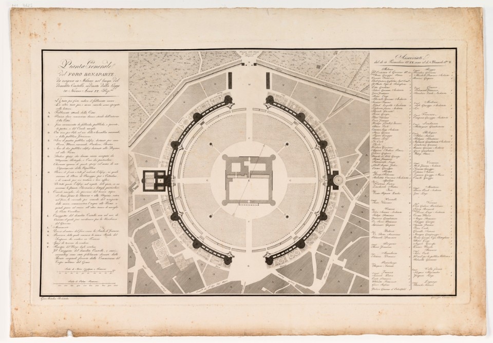 Le principali istituzioni della Milano napoleonica avrebbero dovuto disporsi sui confini di questo invaso, delimitato da un canale anulare collegato ai Navigli e da portici continui. Le piante dell’epoca mostrano la dismisura tra l’immenso Foro e gli isolati minuti della città antica, e tra la perfezione geometrica del primo e l’irregolarità dei secondi. Napoleone si orienta rapidamente verso soluzioni più misurate, materializzate nelle sistemazioni urbane e nelle architetture di Luigi Canonica – l’Arena (1806-1807), l’Arco della Pace e la sua piazza ad emiciclo (1807-1838) –, ma la memoria del progetto dell’Antolini sopravvive nell’attuale Foro Bonaparte, che ne riprende l’impostazione ad arco attorno al castello.