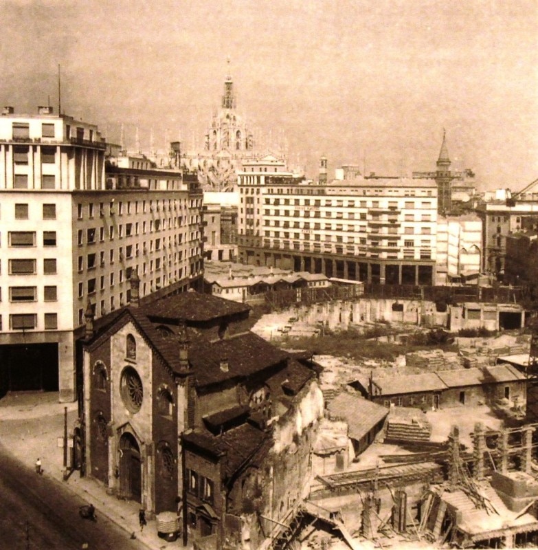 La diabolica “racchetta”, asse di scorrimento veloce che il Piano Regolatore Albertini del 1934 ritaglia nei quartieri popolari a sud del Duomo, esiste davvero tra corso di Porta Vittoria e piazza Missori – è la sequenza delle vie Verzieri-Larga-Albricci – poi si scontra contro i ruderi della chiesa di San Giovanni in Conca e svanisce nella confusione urbanistica di piazza Missori.