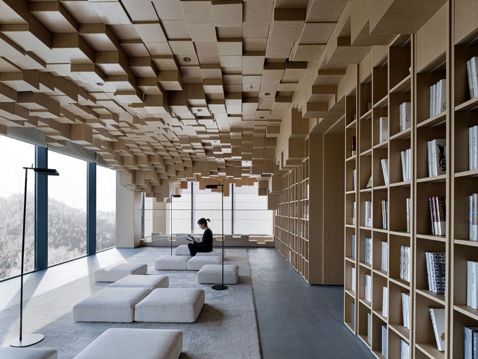 Il paesaggio del sito, tra verdeggianti montagne e aree umide, identificato come elemento di assoluto pregio, è riproposto in chiave astratta all’interno dell’edificio di questa libreria: si miniaturizza il paesaggio tradizionale cinese e lo si riassembla ad una scala controllabile dall’uomo, come nei classici giardini delle case dei mandarini; ma qui tutto avviene attraverso un processo di pixellizzazione tridimensionale che, come affermano gli stessi architetti, si rifà al celebre videogame Minecraft, non solo nelle grafiche cubiche ma anche nell’idea stessa di esplorare lo spazio tra virtualità e realtà. E, aggiungiamo: tra interno ed esterno, tra formale e informale.