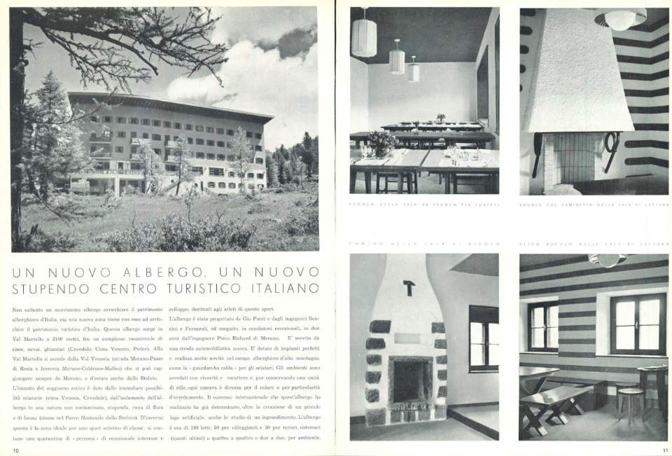L'albergo è stato progettato da Gio Ponti e dagli ingegneri Soncini e Fornaroli, ed eseguito, in condizioni eccezionali, in due anni dall'ingegnere Piero Richard di Merano. È servito da una strada automobilistica nuova. È dotato di impianti perfetti e realizza anche novità nel campo alberghiero d'alta montagna, come la “guardaroba calda” per gli sciatori. Gli ambienti sono arredati con vivacità e carattere e, pur conservando una unità di stile, ogni camera è diversa per il colore o per particolarità d'arredamento. Il successo internazionale che quest’albergo ha realizzato ha già determinato, oltre la creazione di un piccolo lago artificiale, anche lo studio di un ingrandimento. L’albergo è ora di 100 letti: 50 per villeggianti, e 50 per turisti, sistemati (questi ultimi) a quattro a quattro o due a due, per ambiente.