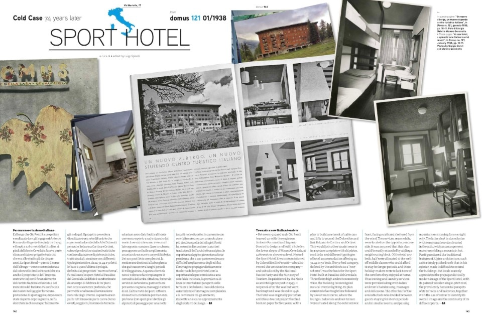 “L'architettura moderna non aspetta il tempo, lo sfida, chi vincerà?”. Sembra pensare al suo Sport Hotel in Val Martello – oggi abbandonato e immerso in paesaggio di luce e di neve – Gio Ponti, quando scrive questa frase nel libro “Amate l'architettura”. L’albergo sorge in Val Martello a 2.160 metri, “fra un complesso incantevole di cime, nevai, ghiacciai”, come si legge su Domus del gennaio 1938. Era un hotel per una borghesia che si spostava sull'alpe portandosi appresso le abitudini di una villeggiatura aperta, fatta di convivenza ma anche d'isolamento. Lo Sport Hotel dava un colpo di coda al turismo alpino con un rifugio dove gli sportivi trovavano ciò che cercavano: neve, sole, paesaggio, locali stretti ma confortevoli, moderne attrezzature sportive. La facciata color fuoco, retaggio della sua seconda fase d'esistenza (nacque verde), ne aiuta l'individuazione: ora l'albergo è più alto di quando è stato pensato e fuoriesce dagli alberi, giacendo silenziosamente in questo paradiso. Questa l'attuale dimensione dell'albergo: un’esistenza fatta di stanze vuote dove ancora sono visibili i cromatismi di pareti e plafoni – tutti differenti – rilevati dal casellario voluto da Ponti, che si spingeva a opzionare la resa grafica di lenzuola e stoviglieria. Come un piroscafo sulla neve, l’albergo vive con distacco il fascino, ma anche i dubbi, di questa lunga attesa.