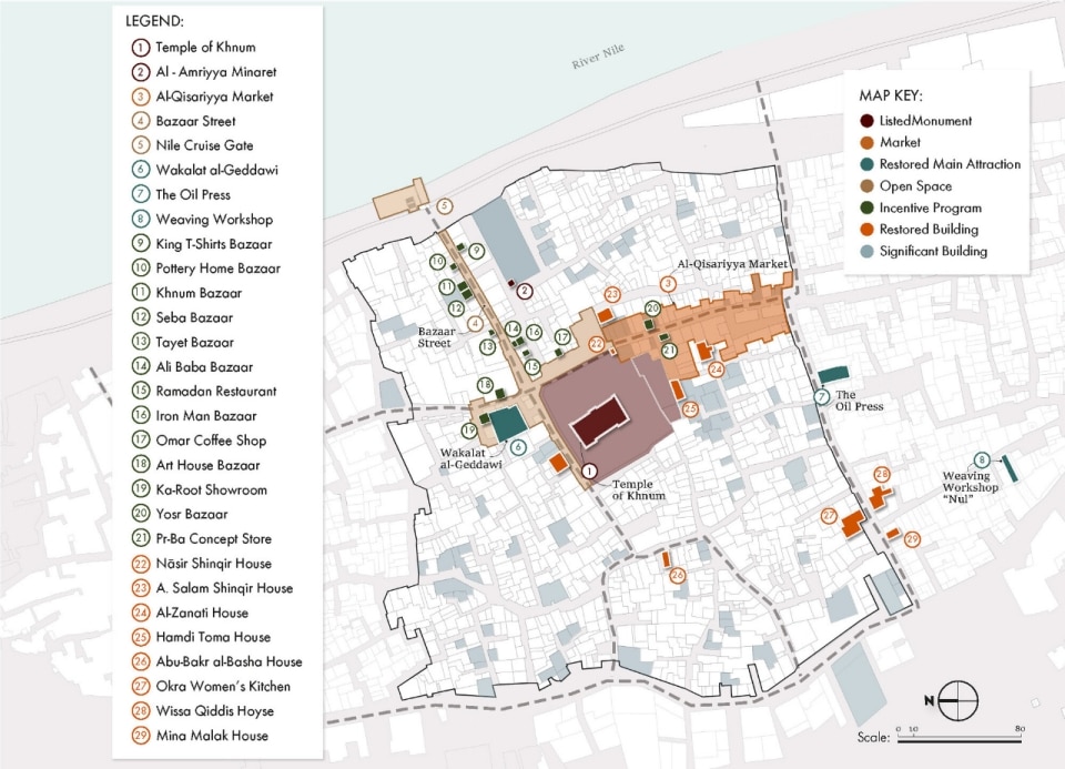 Questa volta si tratta di un progetto che ha l’obiettivo di rendere nuovamente attrattivo un intero centro storico. Nell’Alto Egitto, la città di Esna era nota solo per il Tempio di Khnum. Il progetto guidato da Takween / Kareem Ibrahim, ancora in corso, intende trasformarla in un polo vivo di turismo culturale. Gli interventi hanno riguardato la conservazione e il riuso di diversi edifici e monumenti, come la Wakalat al-Geddawi del XVIII secolo, il mercato Qisariyya e la Guesthouse reale ottocentesca, oltre alla riabilitazione di 15 siti storici, con il recupero di tecniche tradizionali e materiali locali.