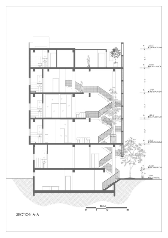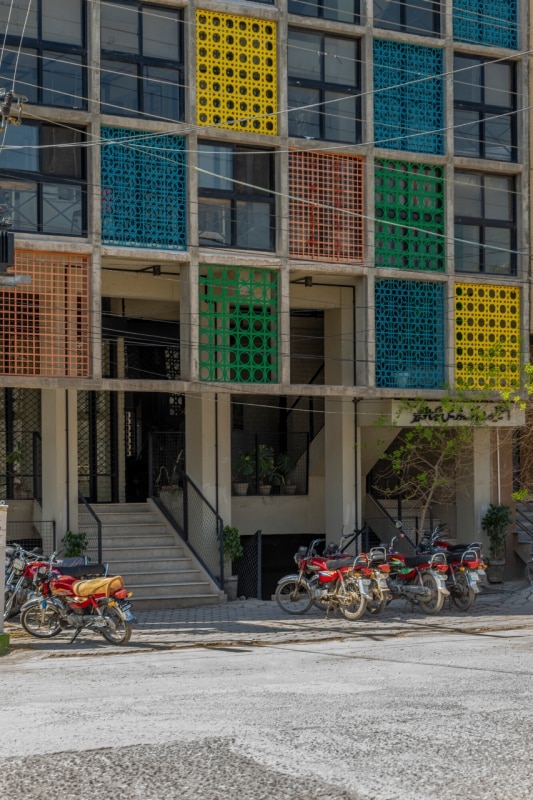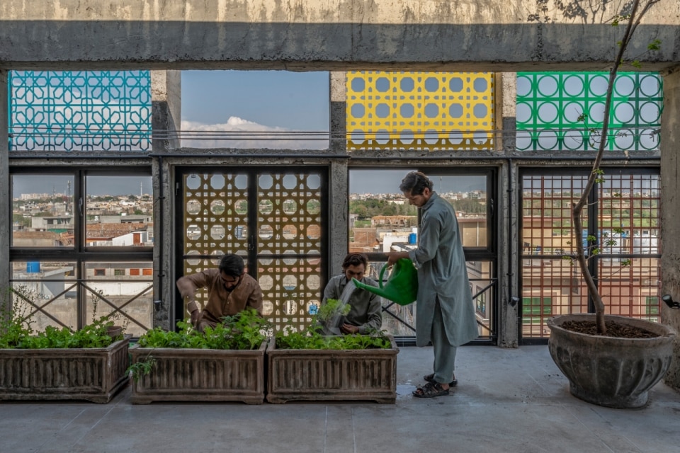 Il centro Vision Pakistan di DB Studios è un progetto sociale nato per offrire una seconda possibilità a giovani svantaggiati. La struttura accoglie attualmente circa 50 studenti tra i 16 e i 25 anni, che seguono un anno di formazione come sarti, per l’integrazione all’interno della società e l’alfabetizzazione. L’edificio, con aule flessibili, spazi ricreativi e un atrio centrale illuminato dalla luce naturale, integra un giardino pensile coltivato dagli studenti. Le facciate in calcestruzzo grezzo sono animate da schermature traforate in metallo colorato (jaali), ispirate all’artigianato pakistano e arabo.