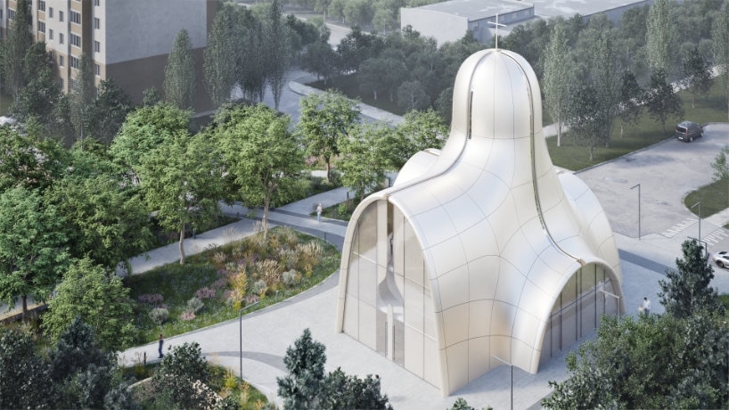La Holy Trinity Church, a Kyiv, per esempio, è una chiesa progettata da Aranchii Architects anche come rifugio antiaereo. Il progetto — che quest’anno ha ricevuto una menzione speciale degli organizzatori del premio “Creator of the Year” per il suo design — nasce per rispondere alle esigenze di sicurezza e di aggregazione comunitaria del distretto di Obolon a Kyiv, una delle aree più colpite dai missili russi. Comprende un rifugio antiaereo sotterraneo raggiungibile anche dalle aree esterne all’edificio, un giardino e una piazza pubblica. La pianta a croce rimanda alle chiese tradizionali ucraine, ma l’insieme è reinterpretato in chiave contemporanea: facciate semitrasparenti che amplificano la luce naturale e una croce zenitale che attraversa la cupola rendono l’edificio una sorta di lanterna urbana.
