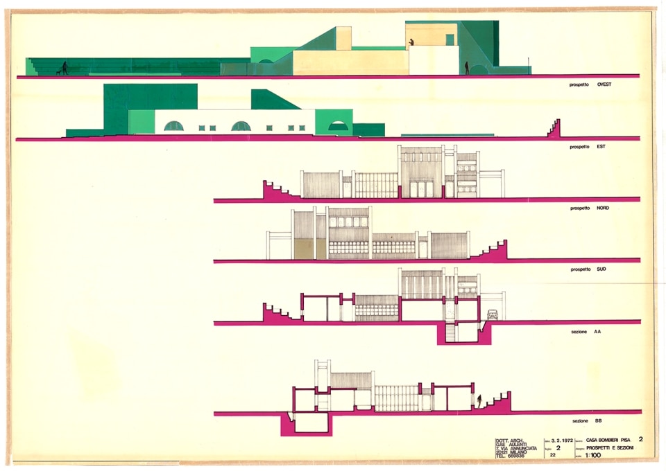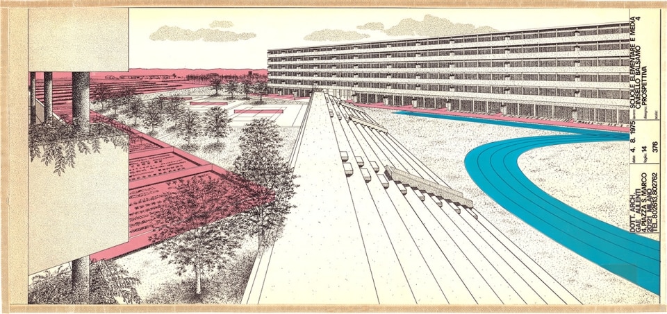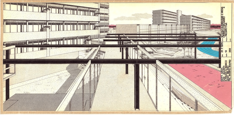 Con gli anni ‘70 si apre infatti la stagione dei grandi piani urbani, e a Cinisello Balsamo, nello stesso anno del progetto di Pisa, Aulenti propone un insediamento residenziale con servizi scolastici, dove nuovamente organizza l’impianto secondo gli assi paralleli delle residenze – vere e proprie fasce “murarie” abitate – con innesti diagonali per i servizi, il tutto saldamente tenuto insieme da una griglia di travi e pilastri che conferisce ai disegni prospettici del progetto la sensazione di una progressione spaziale senza fine.