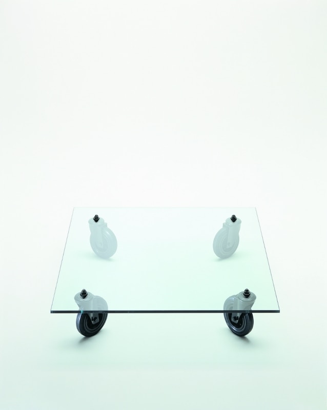 “Minore” ma solo per dimensione, infine, la scala del design. Il Tavolo con ruote prodotto per FontanaArte nel 1980 sintetizza ancora una volta quella convivenza di rigore e gioco che, in modo sempre originale, non ha mai abbandonato la personalità e l’opera della Gae. Con un’operazione apparentemente elementare, ma frutto di un pensiero raffinato e ingegnoso, Aulenti prende i carrelli usati in fabbrica per il trasporto delle lastre in vetro e li rilegge, inserendo ruote industriali con forcelle di metallo sotto un piano in cristallo, e producendo il consueto effetto straniante, e geniale, a lei caro fin dai tempi dell’Arrivo al mare da dove questo racconto è cominciato.