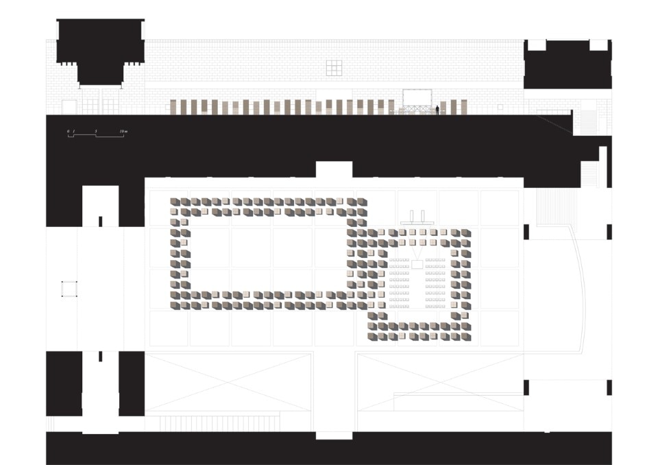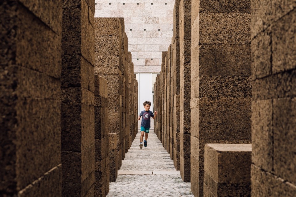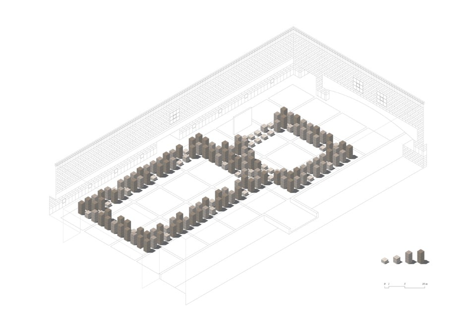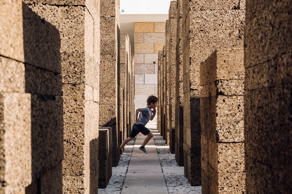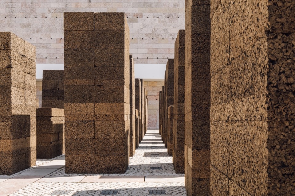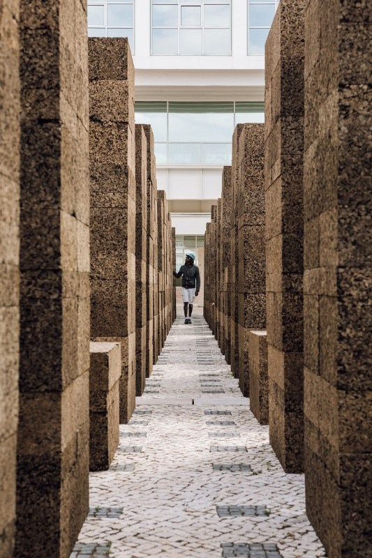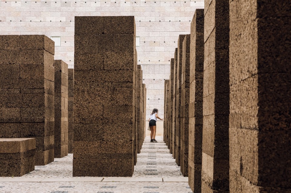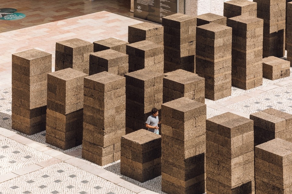 Blocchi di sughero modulari di 1 x 0,5 metri assemblati su una base quadrata di 1x1 metro conferiscono stabilità alla struttura pur nella deperibilità e leggerezza del materiale.