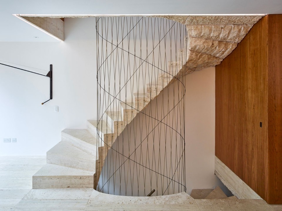 Nodo centrale della casa ristrutturata da Amin Taha + Groupwork a Londra è la scala di travertino dalla forma a spirale e il lato inferiore grezzo, come se fosse stata appena estratta dalla cava.