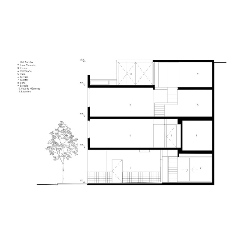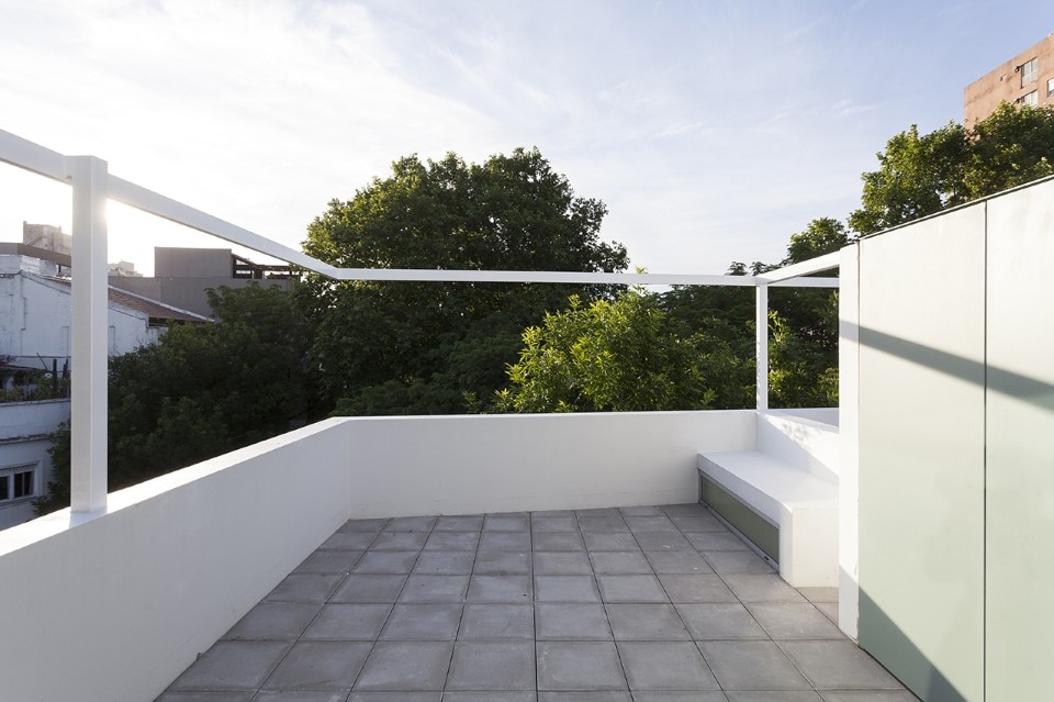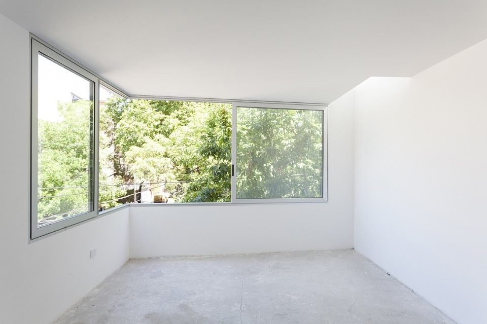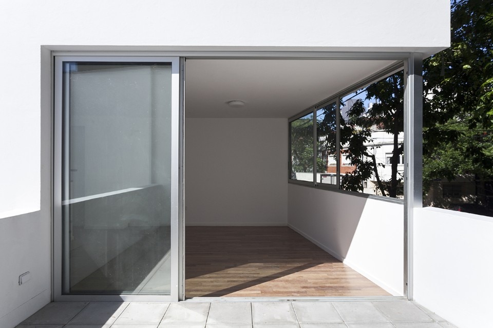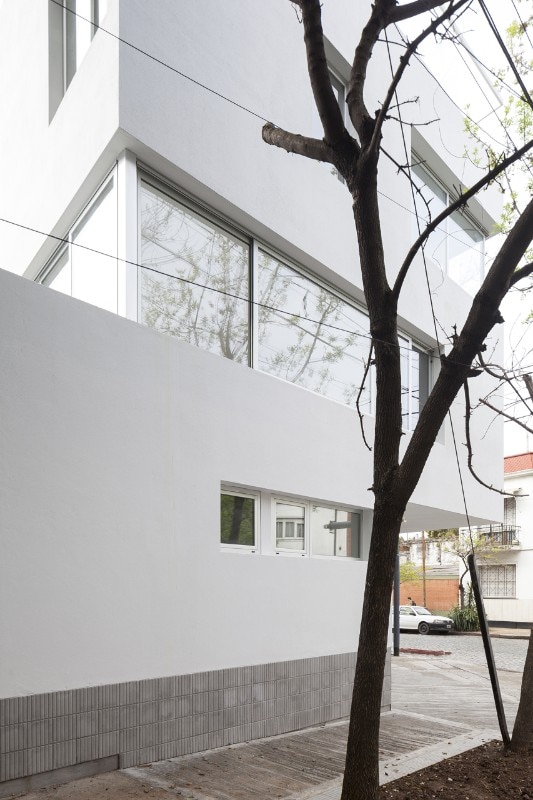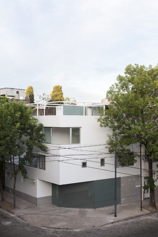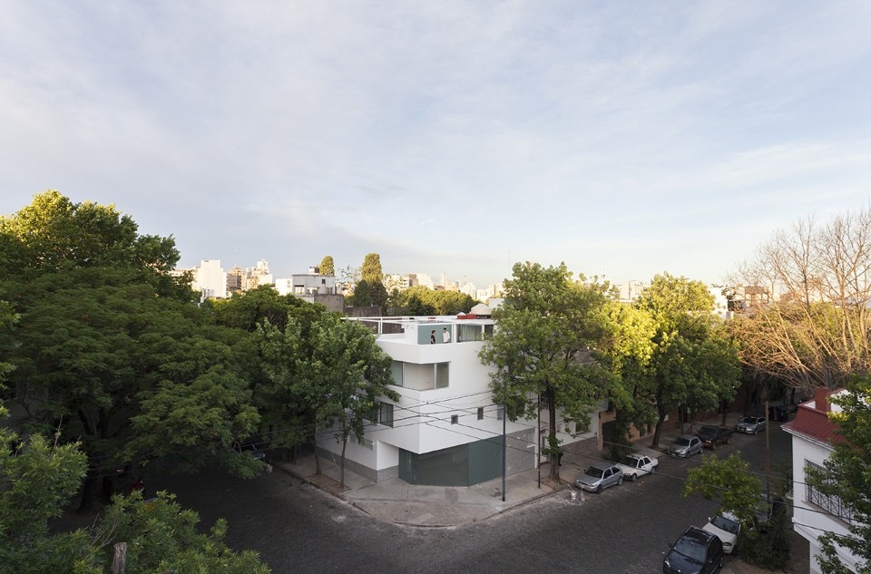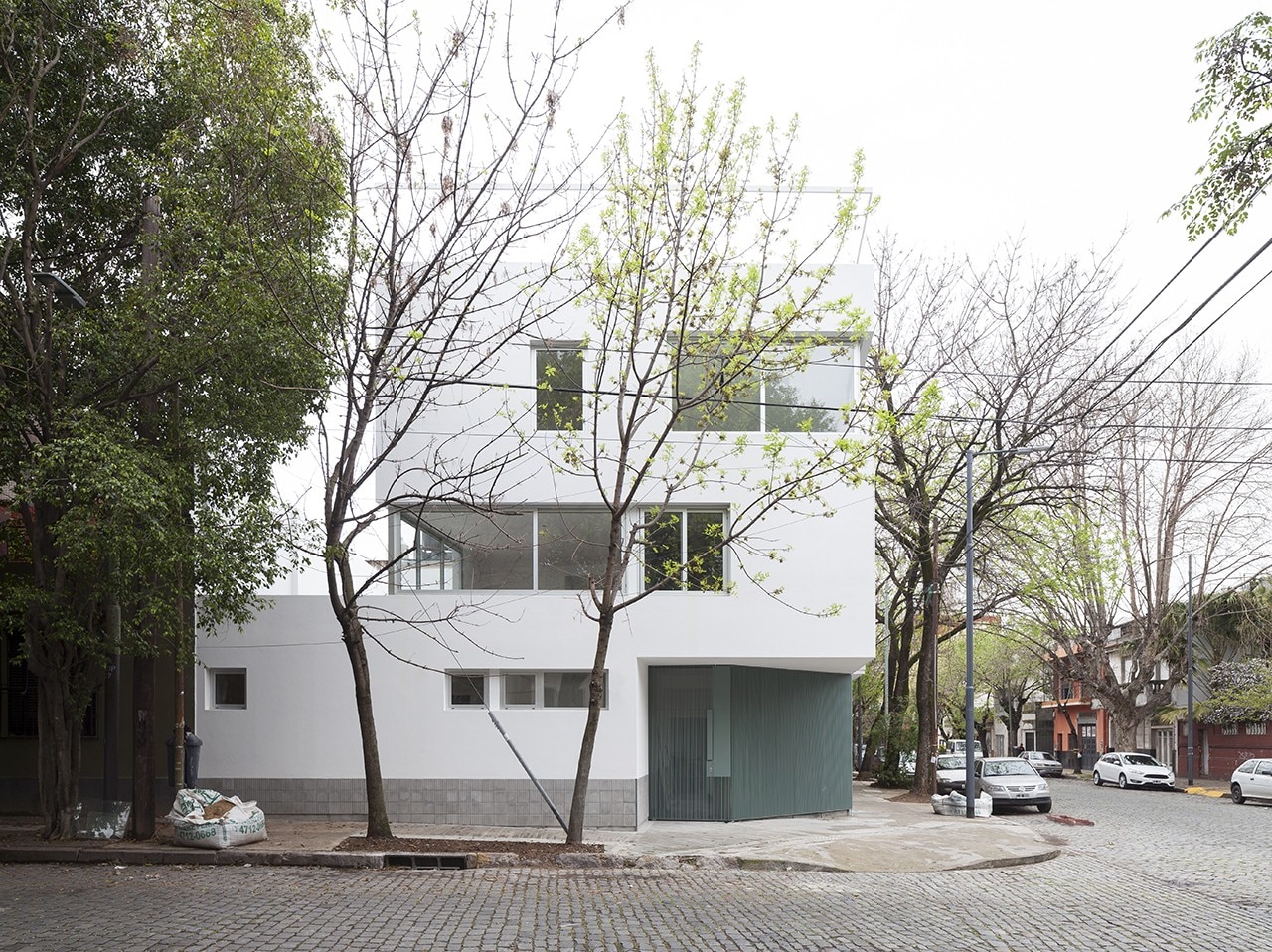 Carlos Cottet e Victoria Iachetti, che hanno fondato il loro studio nella capitale argentina nel 2014, partecipano a questo processo realizzando un’elegante casa per abitazioni. Posizionato su di una parcella d’angolo, l’edificio è modellato innanzitutto per rispondere ai vincoli imposti dal regolamento edilizio, che prescrive lo smusso al piano terra e limita l’altezza costruibile, e dal committente che, trasferitosi nel lotto adiacente, vuole salvaguardare la luminosità del suo nuovo cortile.