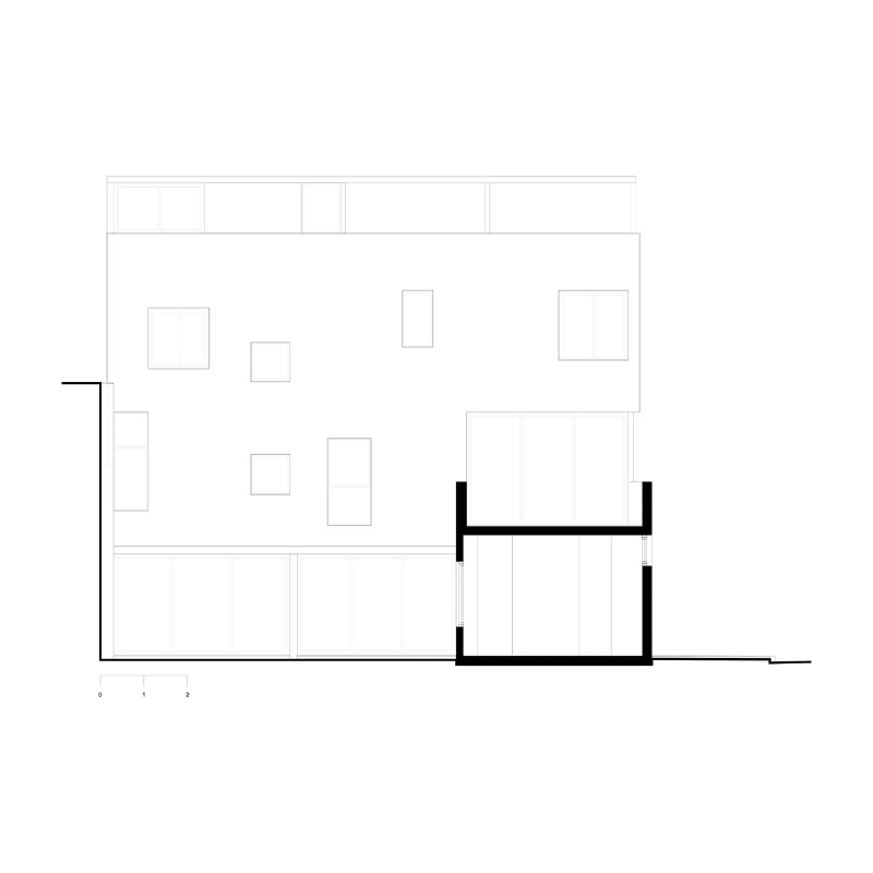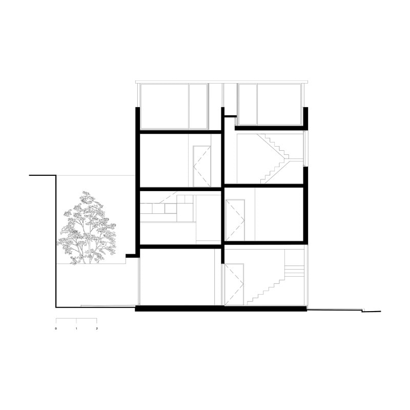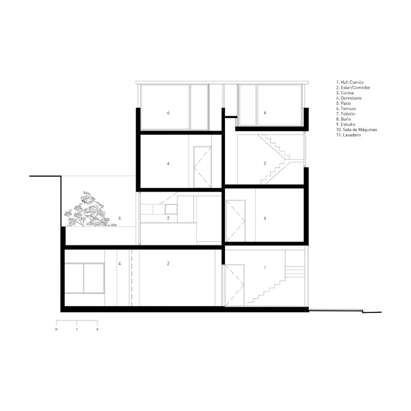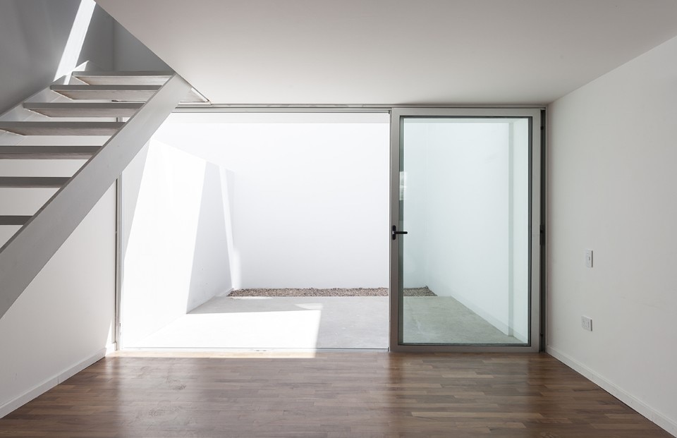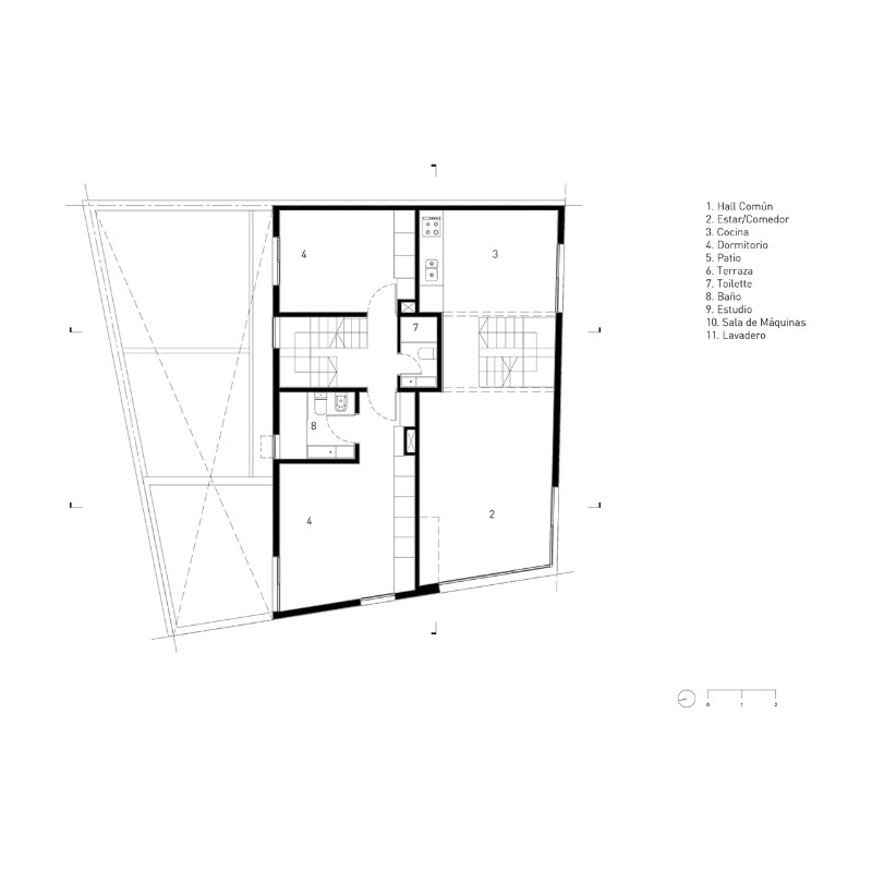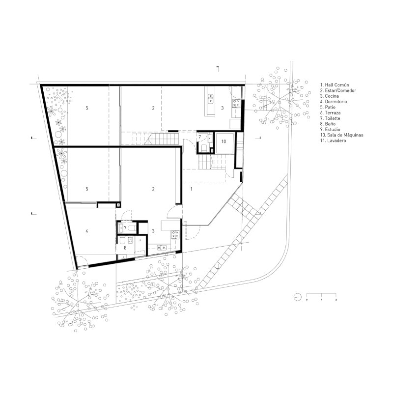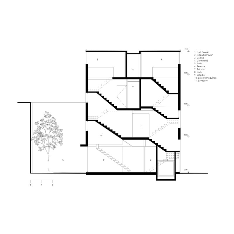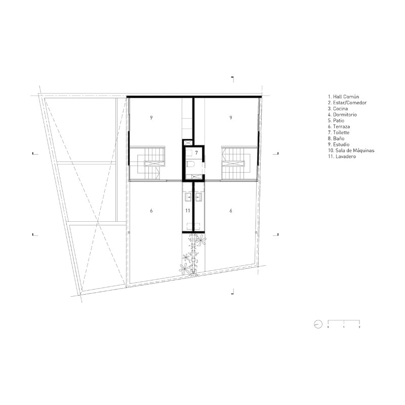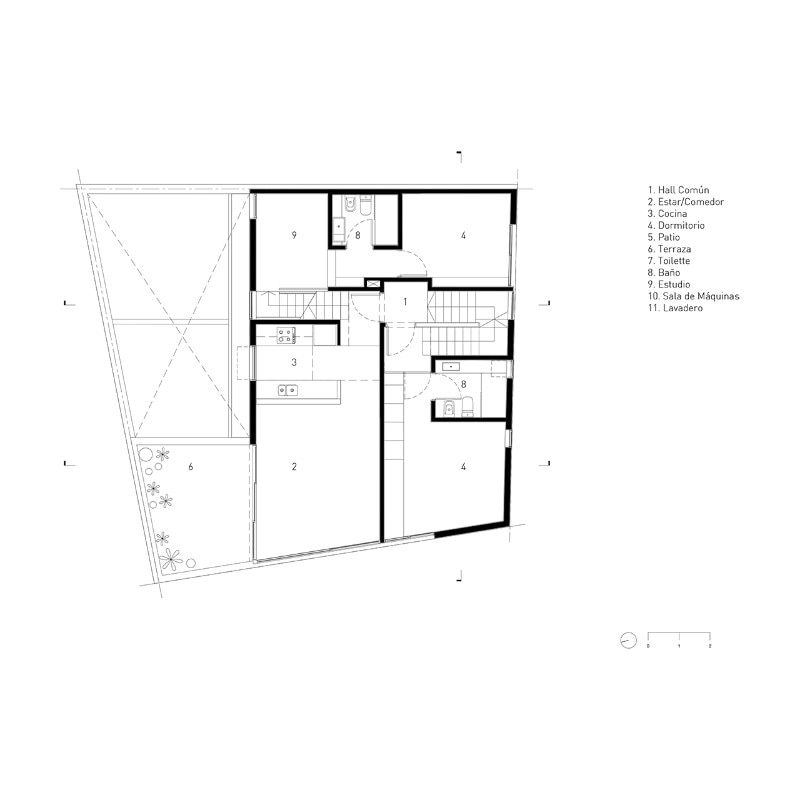 Carlos Cottet e Victoria Iachetti, che hanno fondato il loro studio nella capitale argentina nel 2014, partecipano a questo processo realizzando un’elegante casa per abitazioni. Posizionato su di una parcella d’angolo, l’edificio è modellato innanzitutto per rispondere ai vincoli imposti dal regolamento edilizio, che prescrive lo smusso al piano terra e limita l’altezza costruibile, e dal committente che, trasferitosi nel lotto adiacente, vuole salvaguardare la luminosità del suo nuovo cortile.