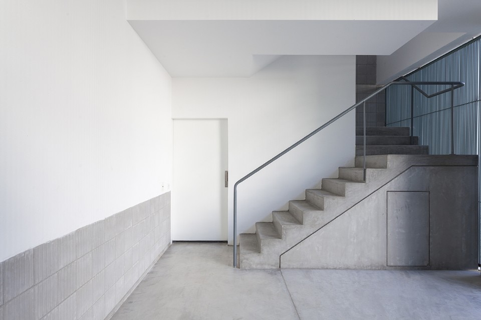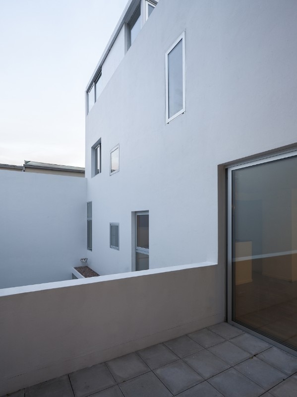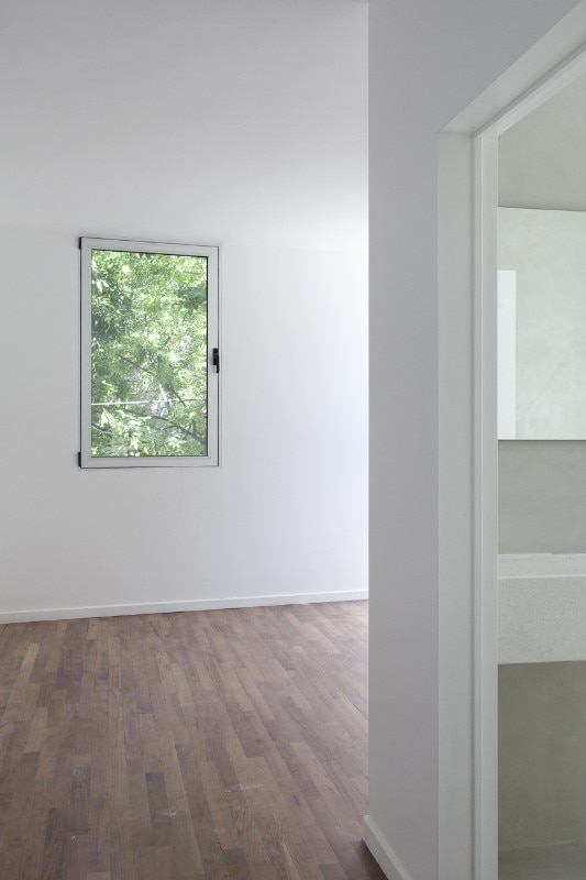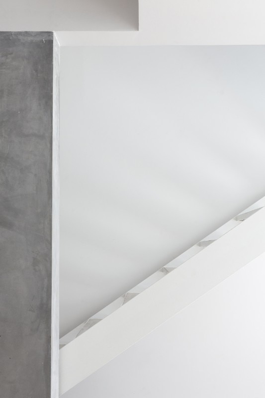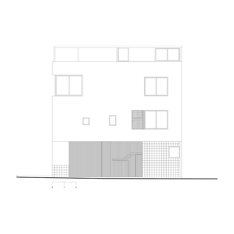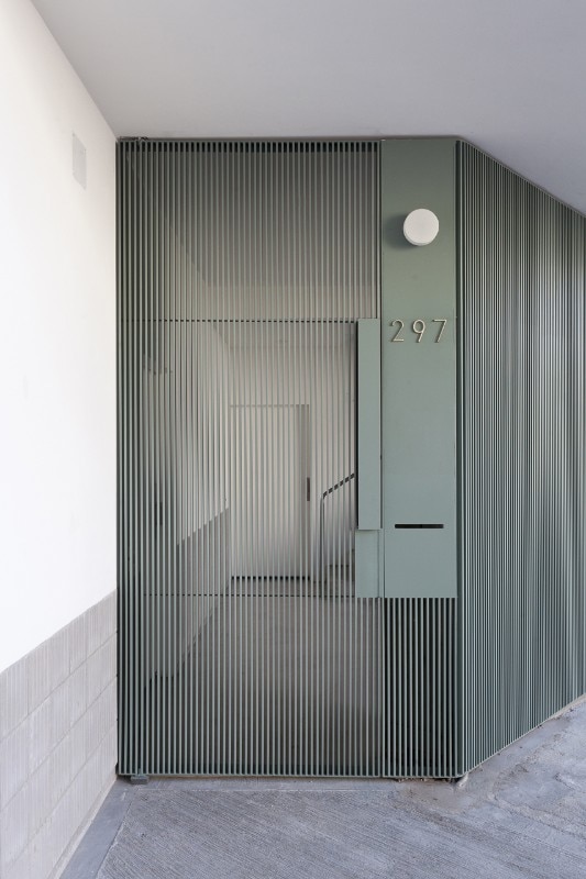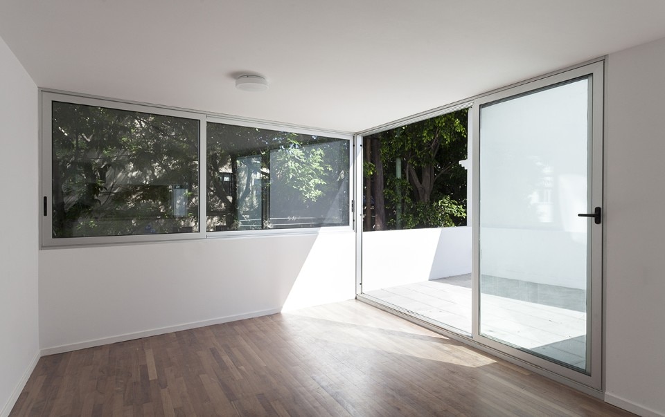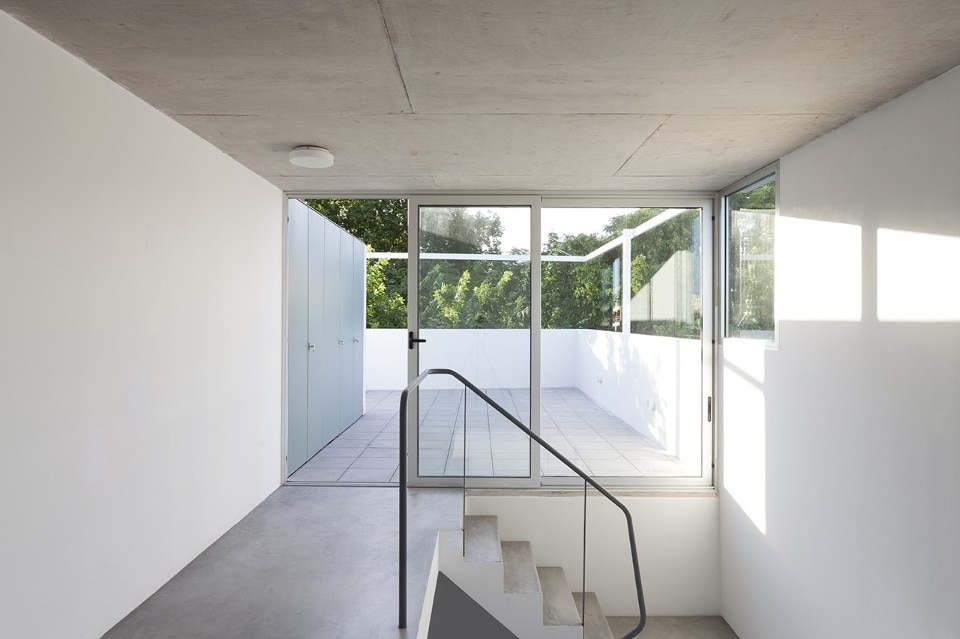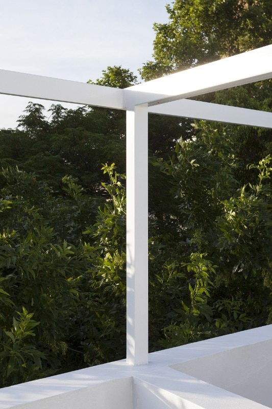A partire da questo volume “regolamentare”, la qualità del progetto risiede nella riuscita alternanza dei pieni e dei vuoti, che permette ad ogni alloggio di disporre del proprio spazio all’aperto, che si tratti di una loggia, di un balcone, o dell’ampio tetto-terrazza. E se nelle finestre a nastro angolari, nei telai che emergono in copertura e nel bianco candido dell’intonaco sembrano risuonare echi lontani e rielaborati del Movimento Moderno, la griglia metallica verde è un interessante dispositivo studiato ad hoc per calibrare il livello di privacy e la continuità con lo spazio pubblico della piccola hall d’ingresso.
