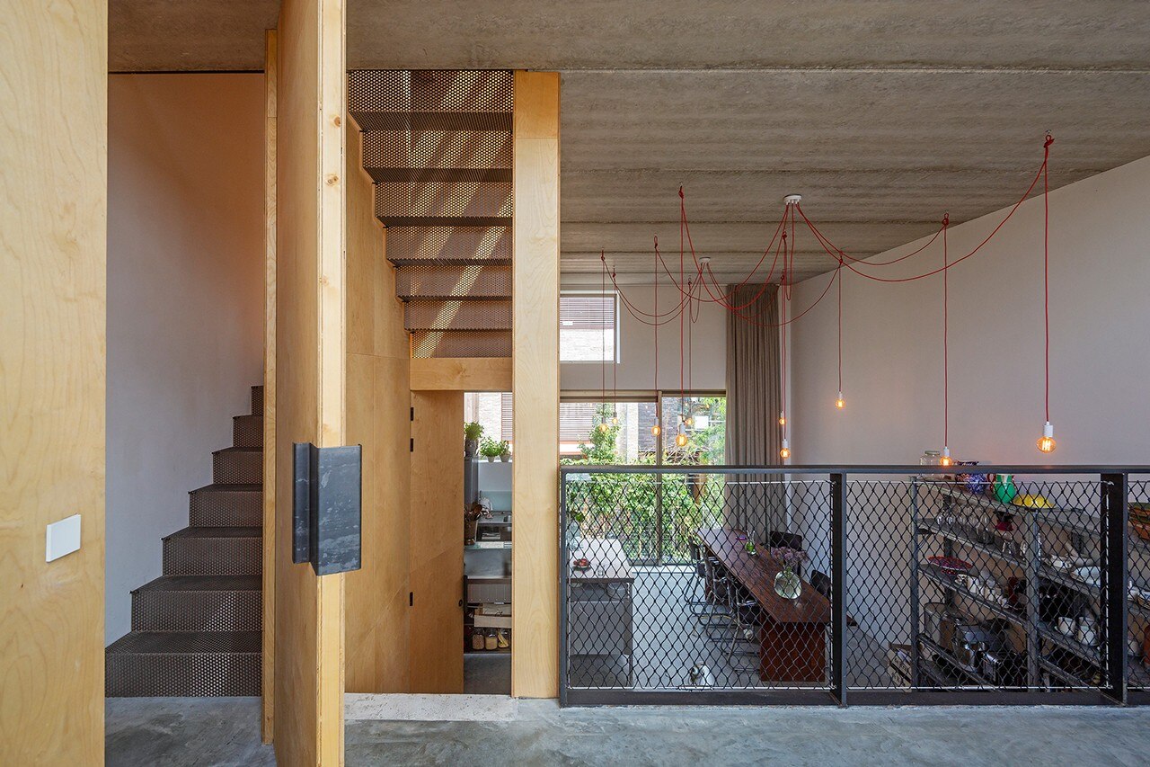 A caratterizzare gli interni del progetto Huis VT contribuisce anche l’alternanza di materiali caldi ed industriali: oltre alla parete di legno troviamo soffitti e pavimento di cemento, scale e ringhiere di metallo e arredi antichi di legno.