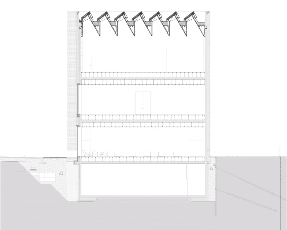 Infine, elemento fondamentale di progetto è l’illuminazione naturale: ai piani inferiori gli interni prendono luce da finestre a tutta altezza, mentre all’ultimo piano sono illuminate zenitalmente grazie a un sistema di 175 shed.