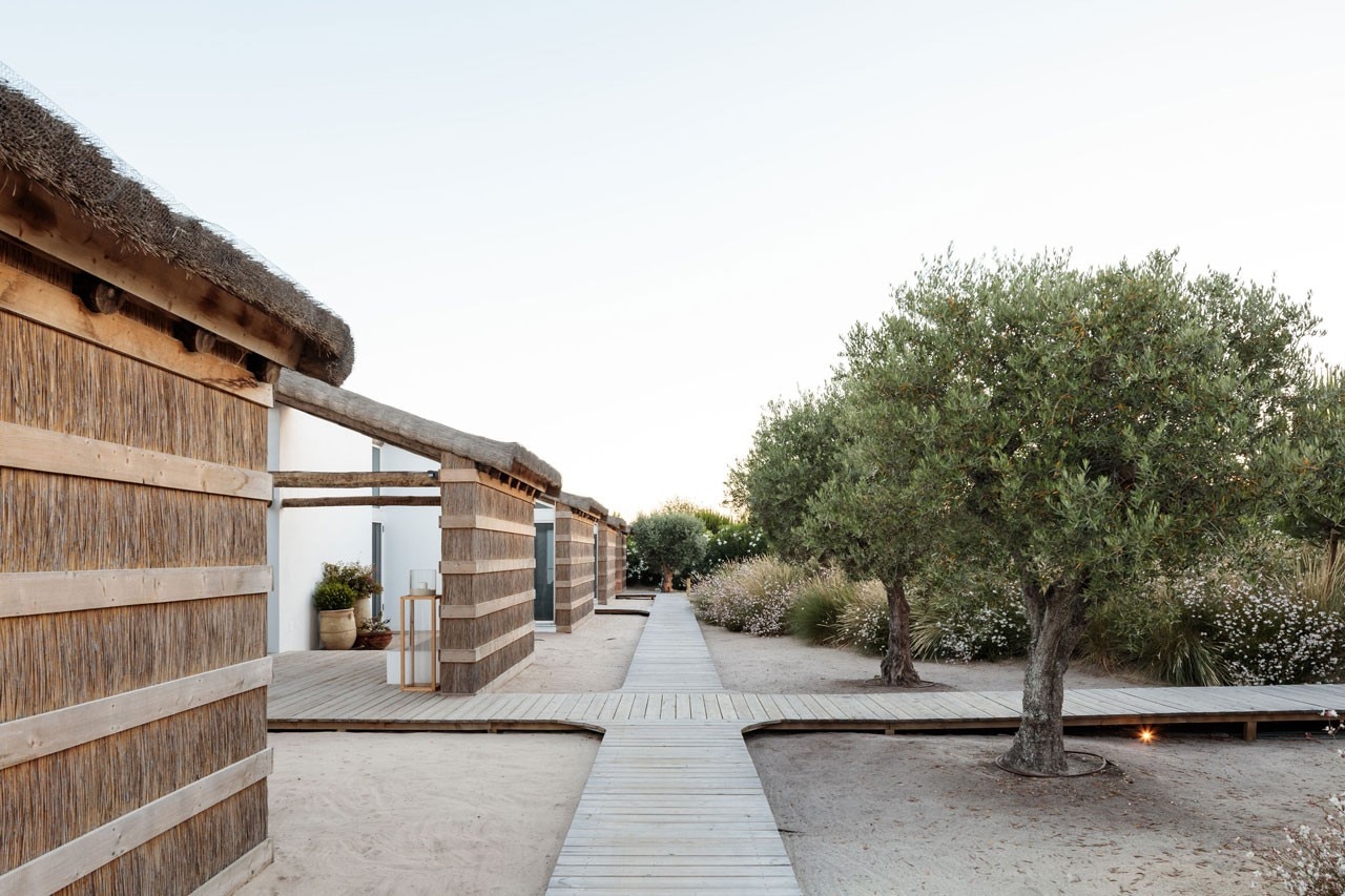 Lo studio ha interpretato la tradizionale capanna delle coste portoghesi, frammentando il volume della casa in tanti moduli intersecati da cortili interni che garantiscono luminosità e una certa complessità visiva. Il tetto, sorretto da travi massicce in tronco e copertura di paglia si contrappone alle pareti bianche, alle numerose aperture vetrate a tutta altezza e al pavimento in cemento spazzolato.