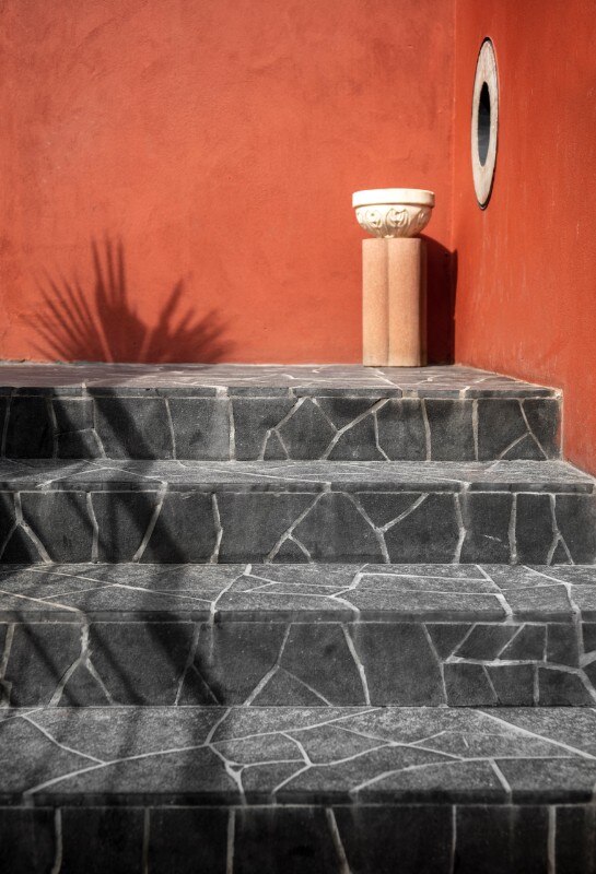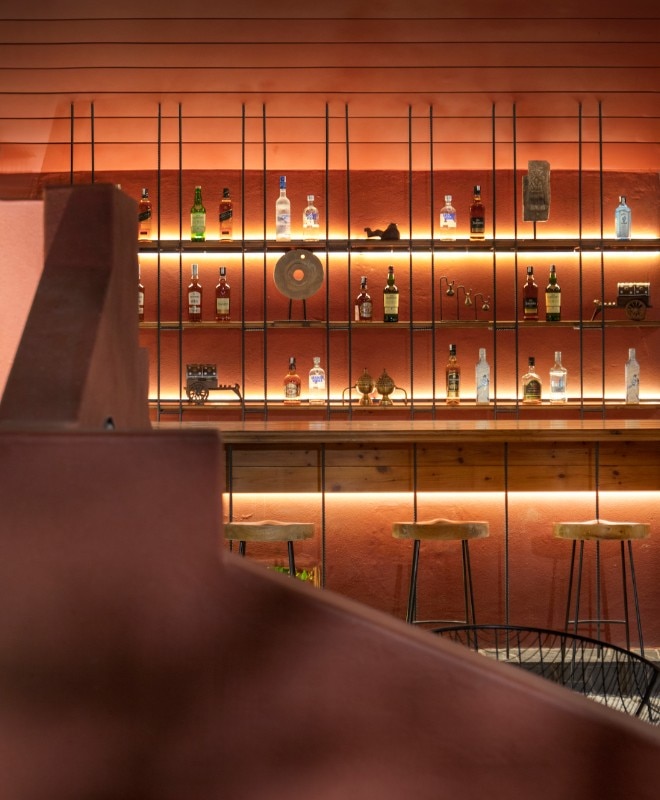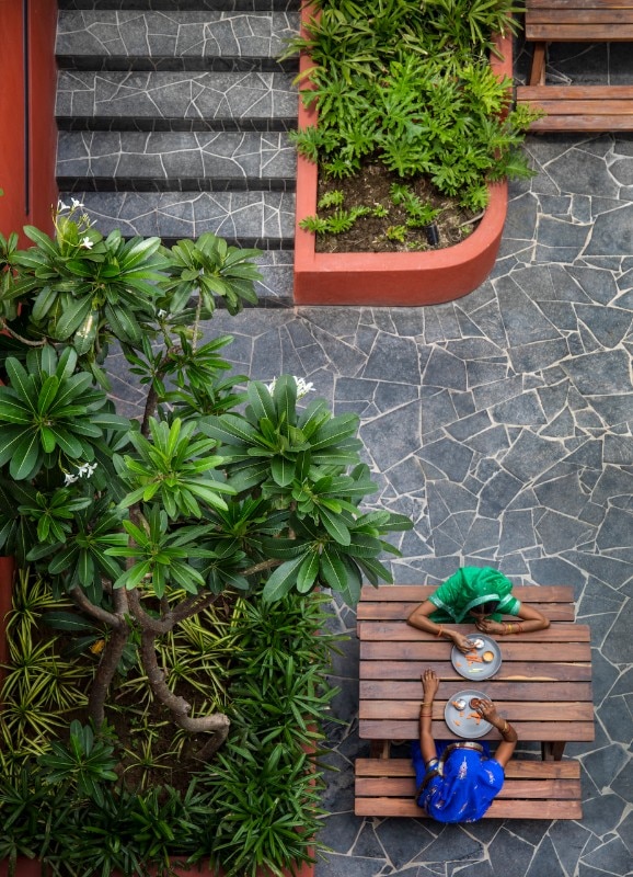 Le pareti sono rivestite da intonaci sui toni della terracotta, mentre il pavimento della corte centrale è costituito da lastre rotte di pietra locale di Kadappa, nera e grezza. Cerchi di cemento punteggiano le pareti e offrono una vista sulle piante che circondano i volumi. Una struttura vetrata completa la struttura del The Village Cafe: cemento bianco e lampade a sospensione creano un leggero contrasto con l’esterno, ma mantenendo sempre un legame con esso attraverso forme e geometrie.