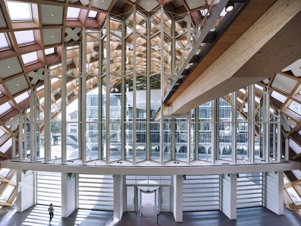 La struttura di Shigeru Ban è lunga 240 metri, larga 35 e raggiunge i 27 metri nel suo punto più alto. Un edificio luminoso che, con una superficie di 25.000 metri quadrati distribuita su 5 piani, trova spazio a 400 postazioni di lavoro. Numeri impressionanti per questo tripudio di forme bombate, trasparenze, colori ed elementi costruttivi anche classici ma reinterpretati in modo inedito.