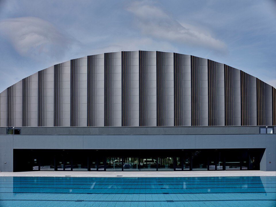 Molti elementi contribuiscono a questa inattesa riabilitazione: l’imponente volta a botte che si eleva sopra la vasca olimpionica, l’elegante ‘plissettatura’ delle facciate, l’allineamento dell’atrio d’ingresso e delle due piscine principali (di cui una all’aperto) in una sequenza quasi processionale di aule, oltre che la complessiva generosità di tutti gli spazi, quantitativa e qualitativa.