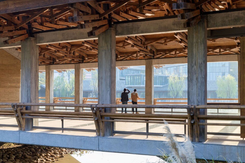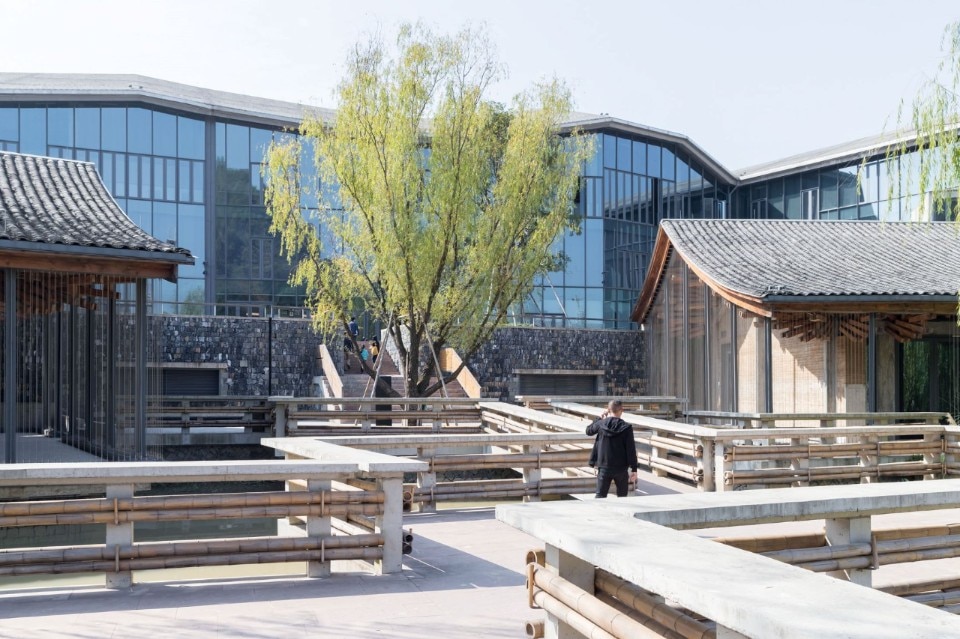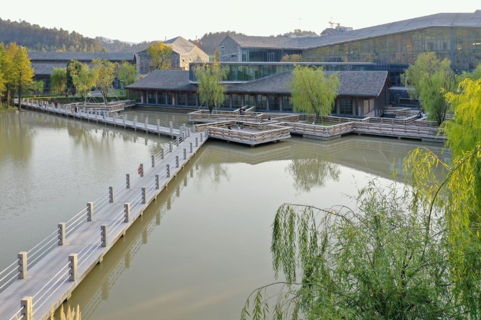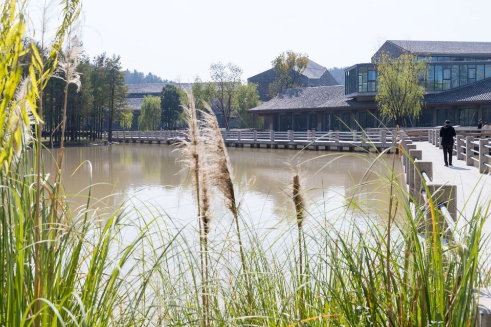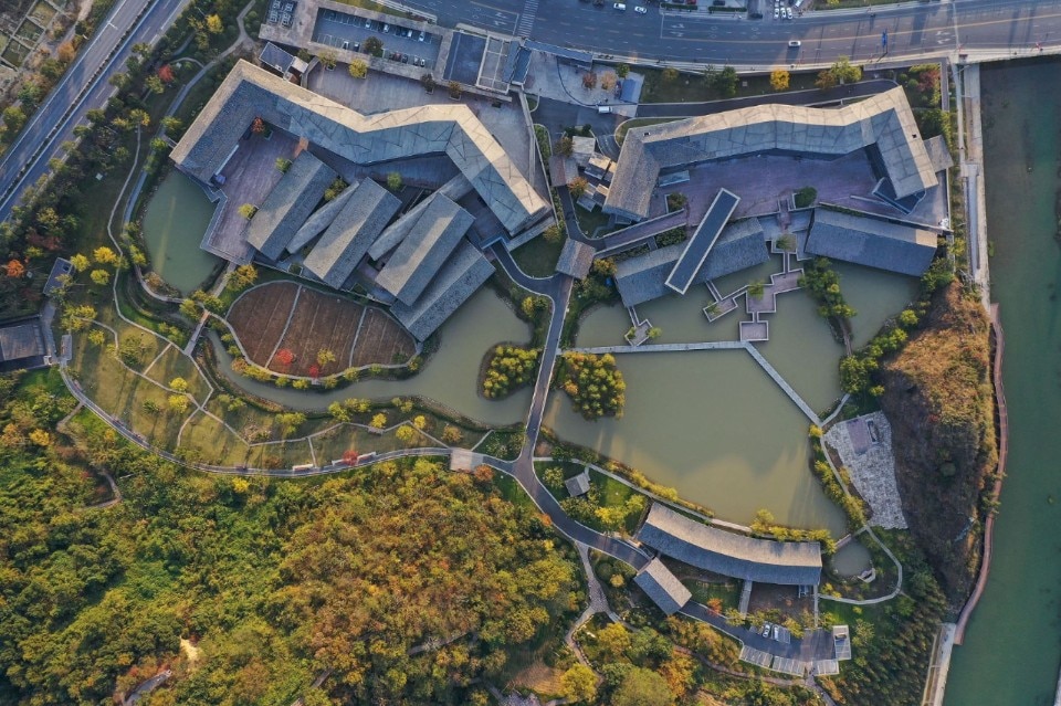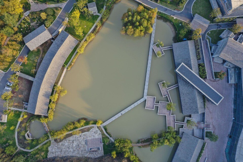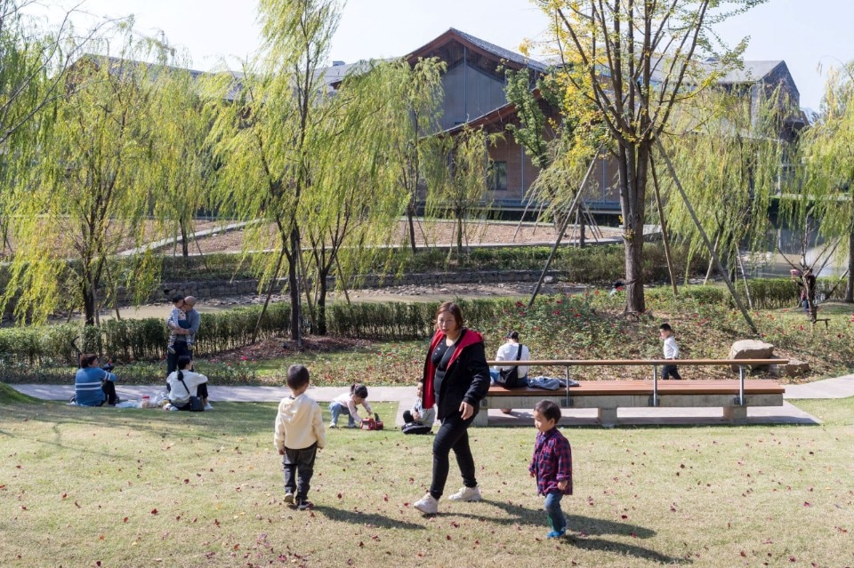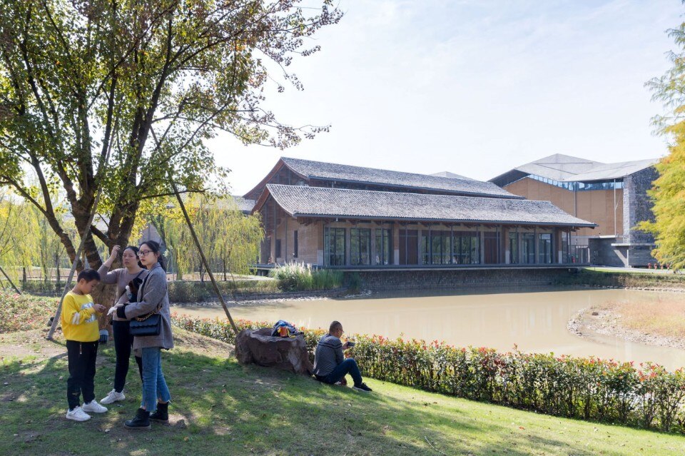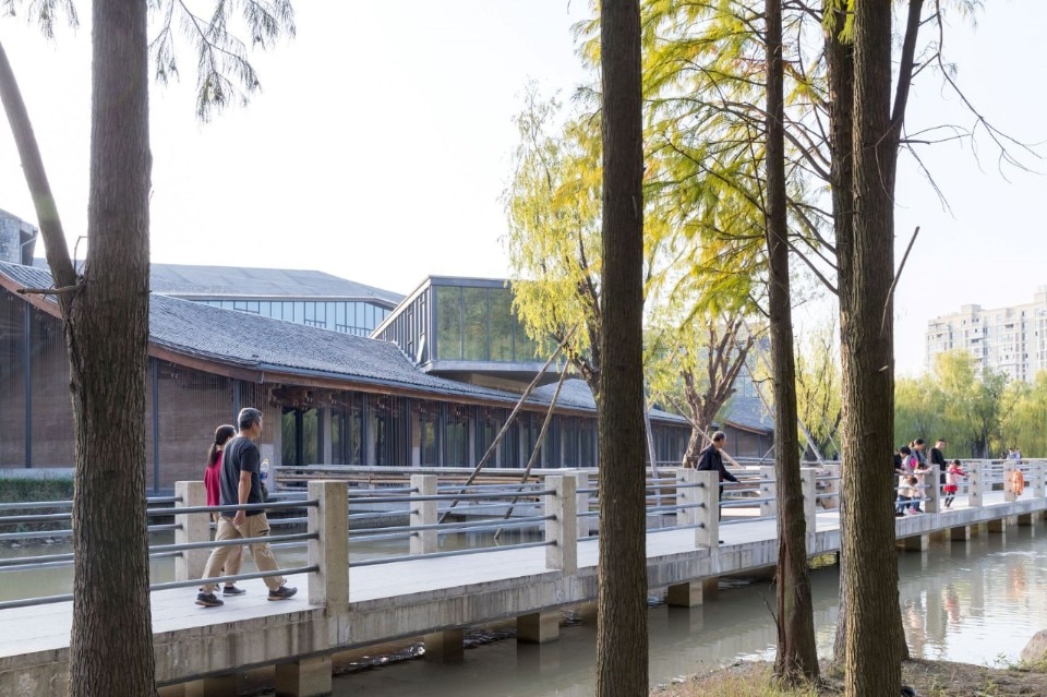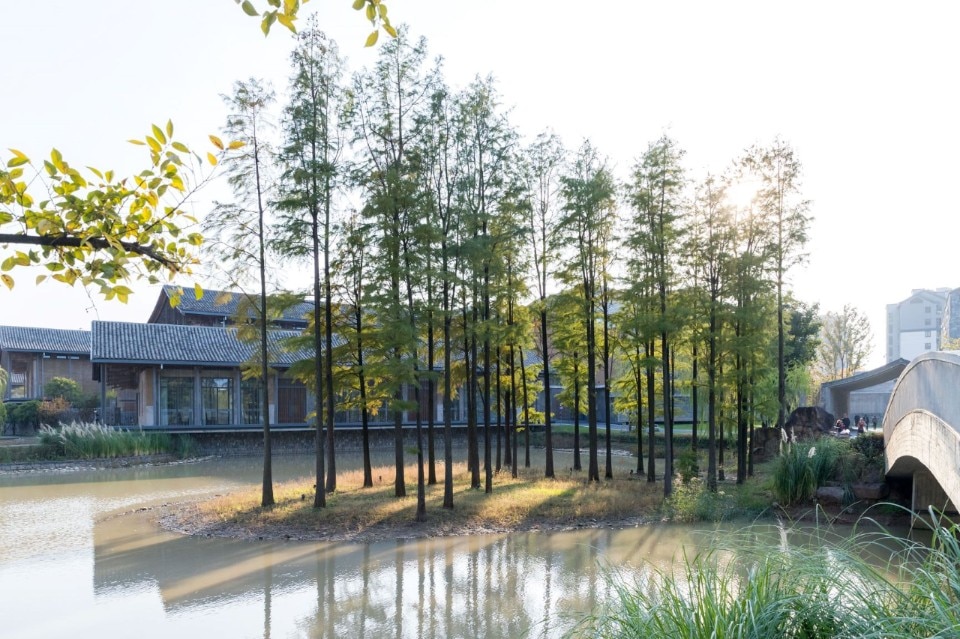 Lo sviluppo del parco culturale Wuyue, sulla riva sinistra del bacino idrico di Qingshan, aveva tre obiettivi specifici: innalzare il profilo della città, fornire strutture ricreative per residenti e turisti e creare ulteriori opportunità per attività economiche e commerciali. Lu Wenyu spiega che il sito era originariamente occupato da un villaggio: “Nell’ambito del progetto siamo riusciti a preservare una vasta area di terreni, non solo come paesaggio, ma anche come archivio di ricordi della storia agricola del villaggio”, dice.