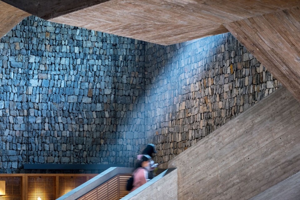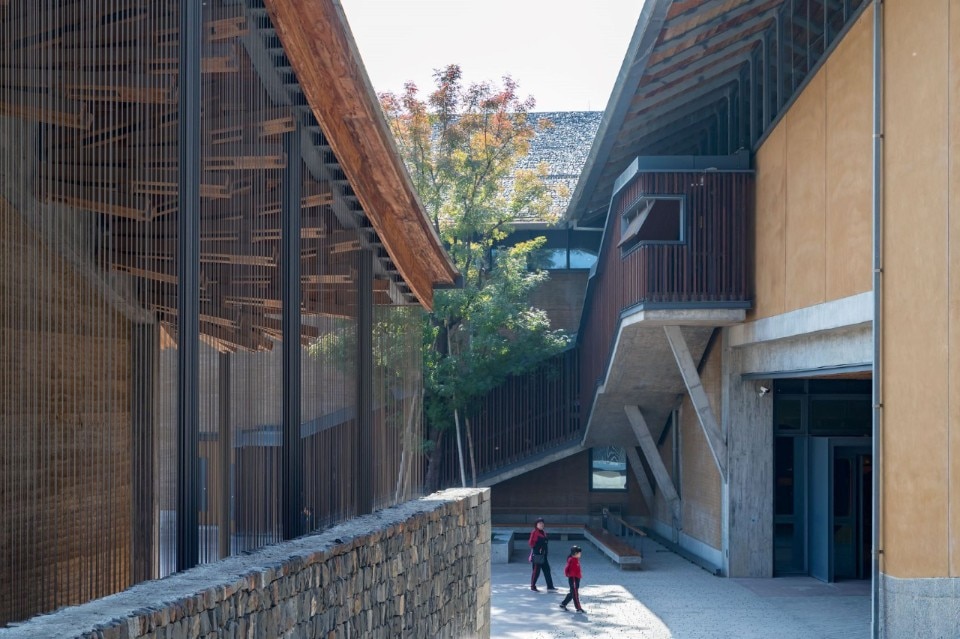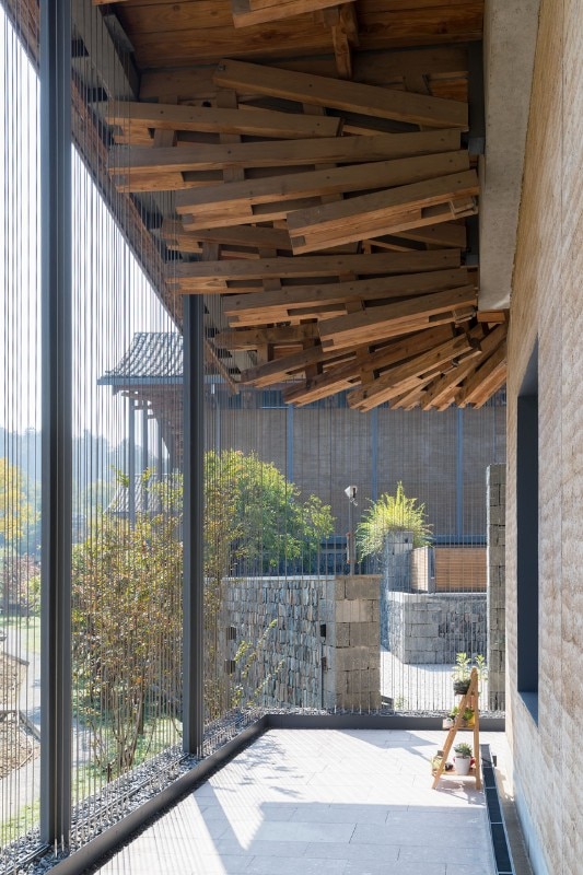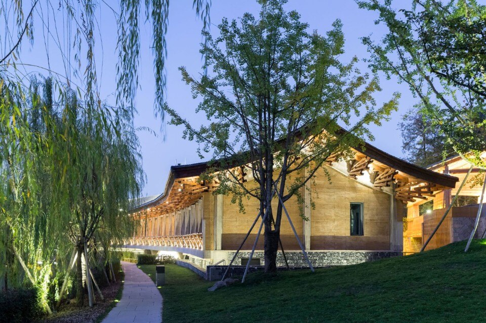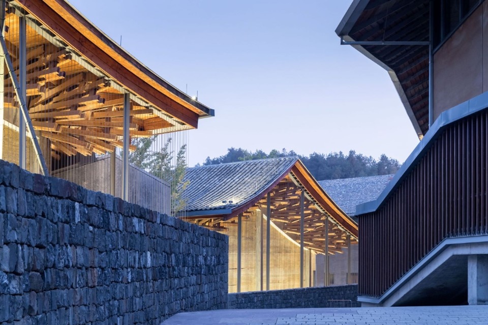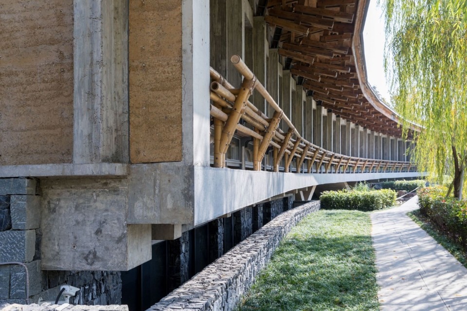 Nel lavoro di questi architetti – con l’utilizzo di muri di pietra e sassi, di bambù di provenienza locale e di terra battuta – è del tutto prevedibile una ricca tettonica. Ma ci sono anche soluzioni di compromesso e, per motivi strutturali ed economici, la terra battuta è stata sostituita in alcune parti con cemento rinzaffato. Allo stesso modo, la struttura del tetto di legno, con scenografici dettagli dougong a incastro con la grondaia, è completata da travi e tiranti di acciaio e da cornici di cemento delle porte. Di nuovo Lu Wenyu: “In precedenza, l’impresa edile non aveva mai usato molti dei nostri metodi costruttivi: per loro, si è trattato spesso di un esperimento”.