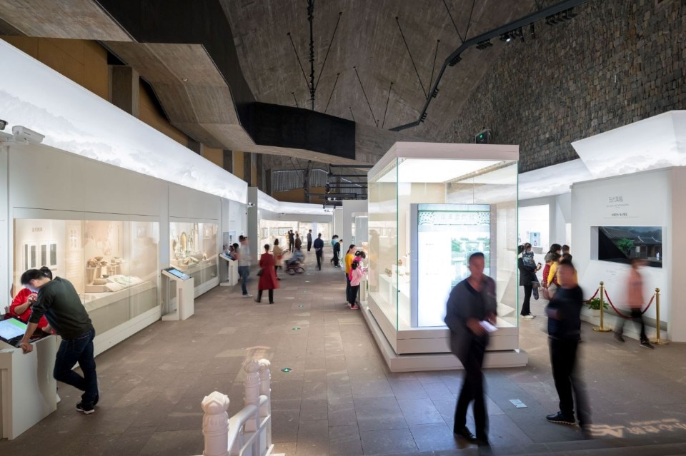 Ognuno degli spazi museali successivi, a cui si accede in una progressione lineare attraverso l’edificio, presenta un disegno che rimanda alla tipica sala comunale del villaggio cinese: uno spazio a pianta aperta con un tetto curvo a falde, che all’interno rispecchia la forma esterna. Alcuni di questi spazi espositivi sono comunicanti, altri sono collegati da rampe chiuse piuttosto incongrue. Complessivamente, le costruzioni salgono il pendio in una rigida gerarchia di stanze, che riflette anche la struttura di un villaggio tradizionale. Il senso dell’avventura è mantenuto grazie a corridoi bui, rampe nascoste e recinti angusti che si aprono inaspettatamente sullo spazio espositivo successivo.